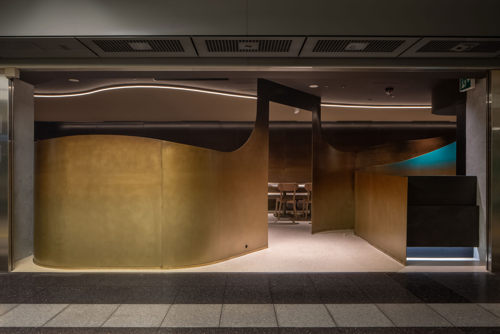 吉村靖孝とナノによる、愛知・名古屋市の「鈴波 栄 森の地下街店」。地下街の細長い区画。“上質な空間体験”を求め、高さを変えながら湾曲する“6mmの鉄板”壁で“奥行きと陰影”を創出。上がり天側に各種設備をまとめた“折上天井”として“美しい仕上げ”の水平面もつくり出す西側の共用通路より壁越しに「膳処」を見る。 photo©トロロスタジオ