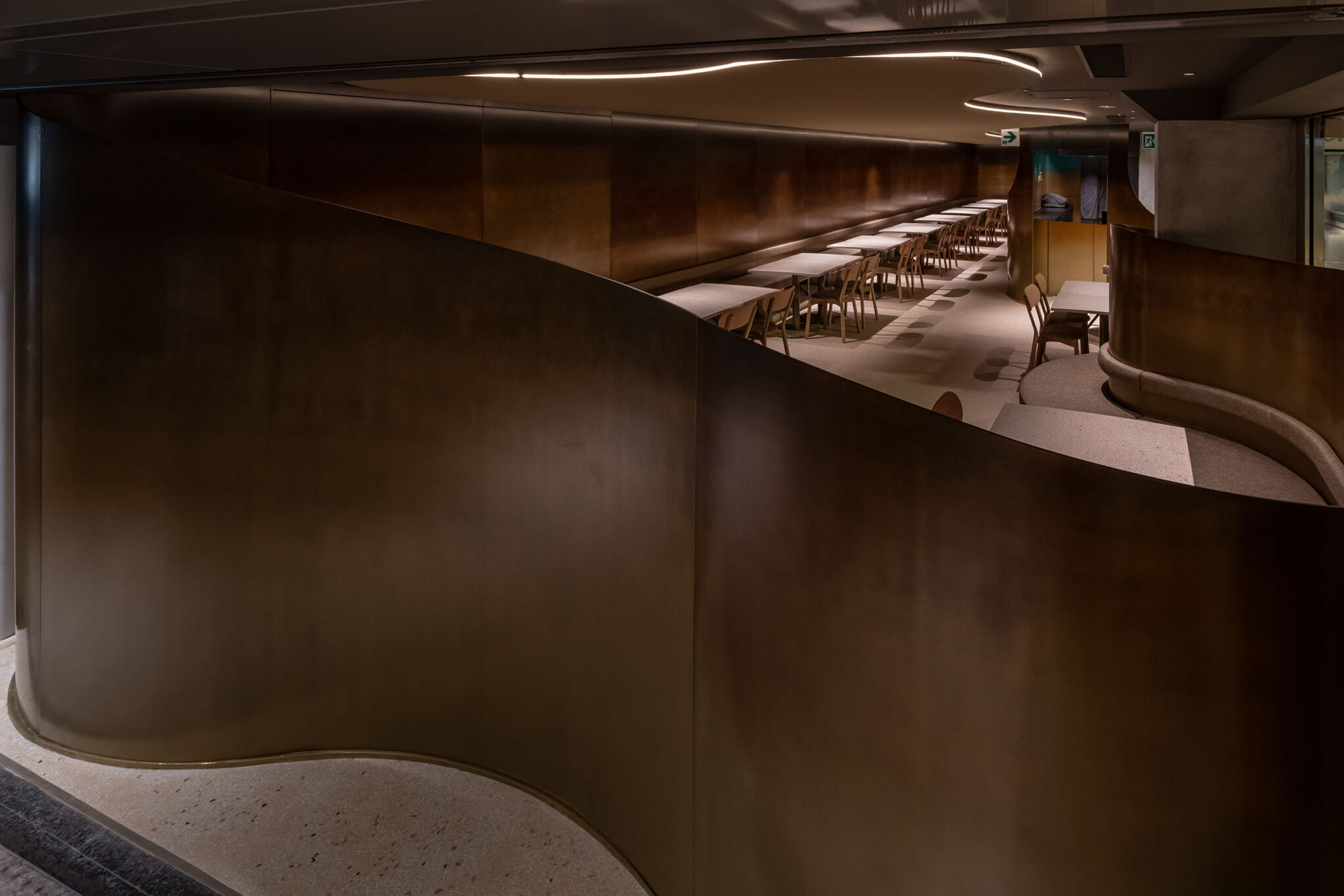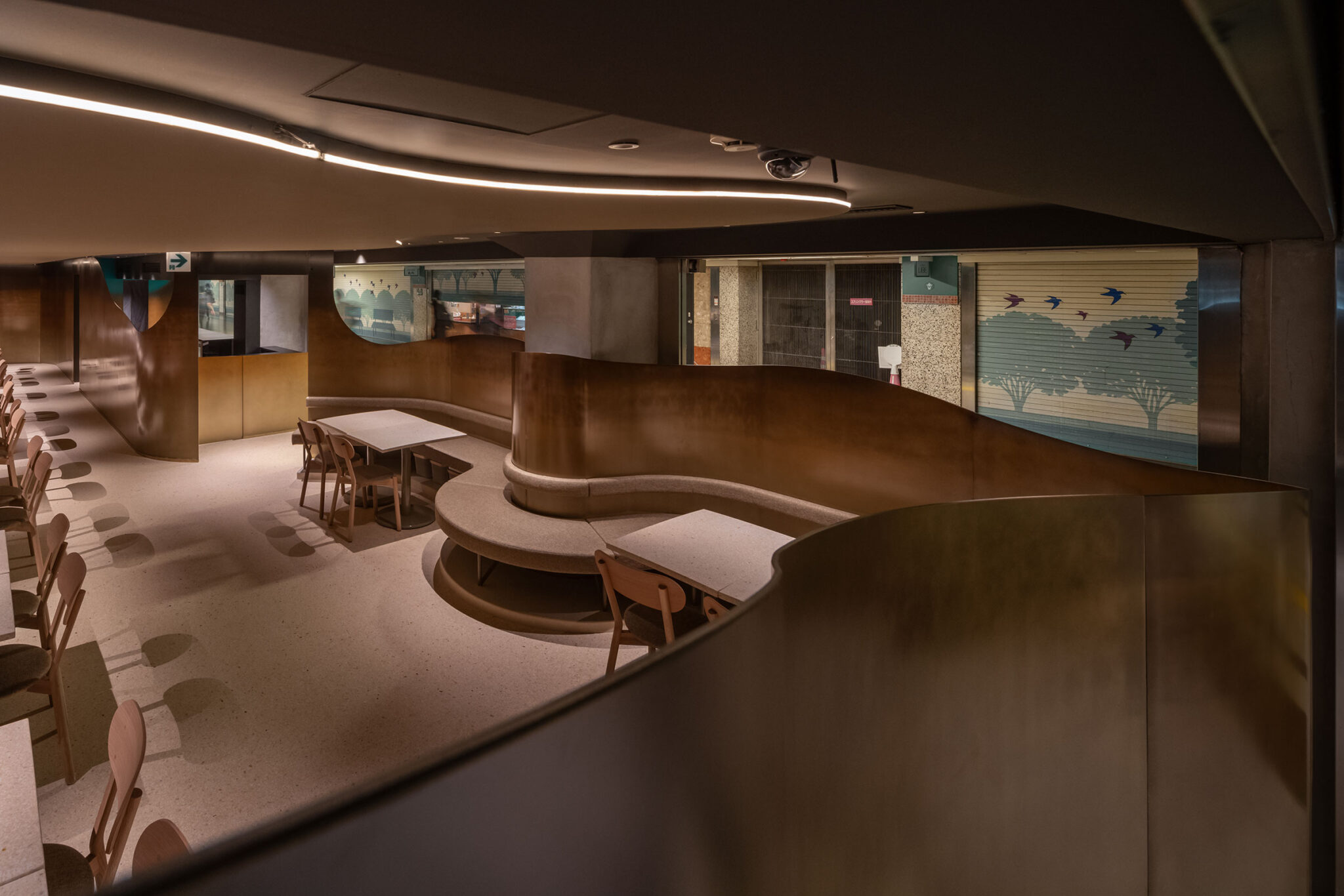 地下街の細長い区画での計画です。建築家は、“上質な空間体験”を求め、高さを変えながら湾曲する“6mmの鉄板”壁で“奥行きと陰影”を創出しました。また、上がり天側に各種設備をまとめた“折上天井”として“美しい仕上げ”の水平面もつくり出しています。店舗の場所はこちら(Google Map)。