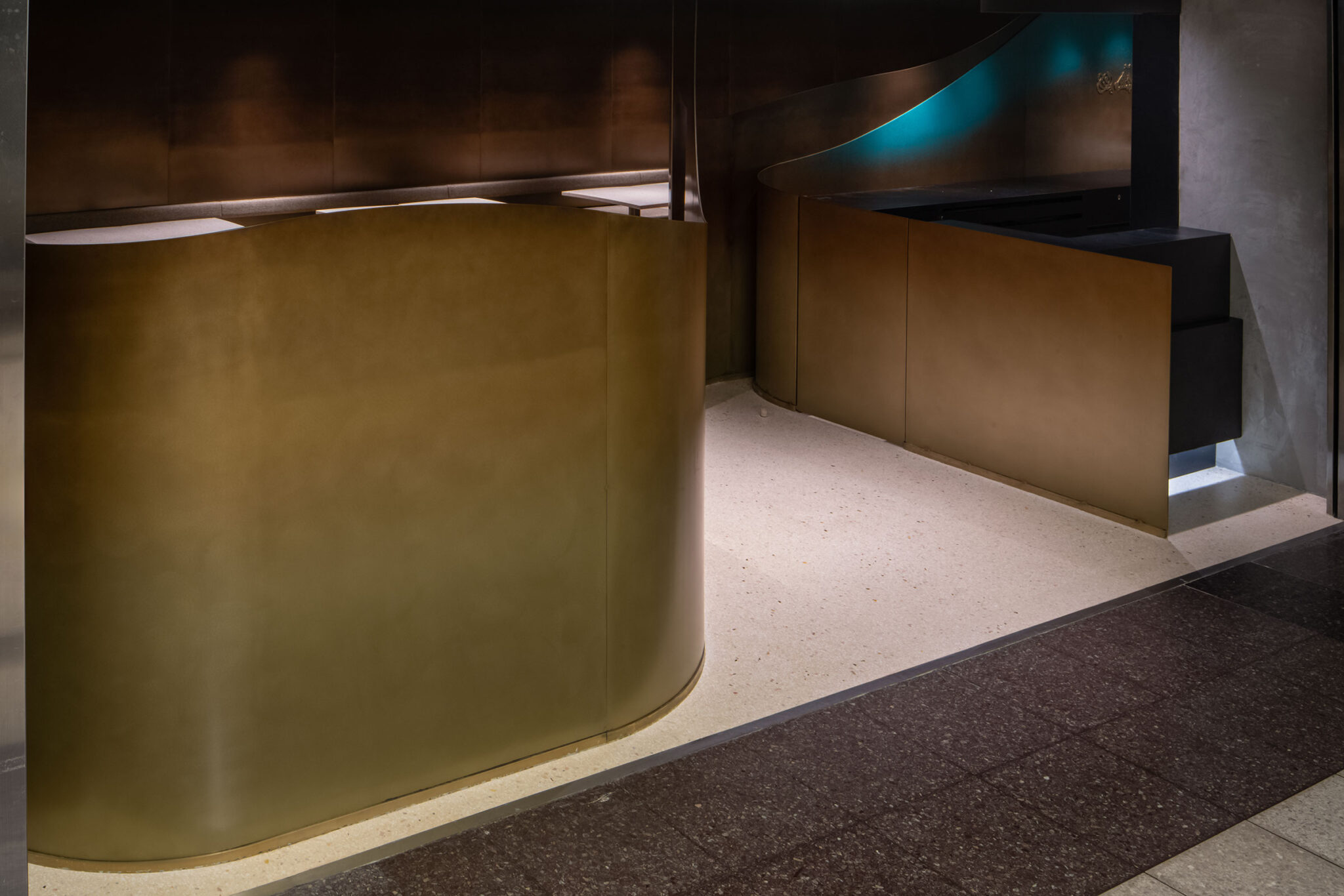 吉村靖孝とナノによる、愛知・名古屋市の「鈴波 栄 森の地下街店」。地下街の細長い区画。“上質な空間体験”を求め、高さを変えながら湾曲する“6mmの鉄板”壁で“奥行きと陰影”を創出。上がり天側に各種設備をまとめた“折上天井”として“美しい仕上げ”の水平面もつくり出す「膳処」、家具と床の詳細 photo©トロロスタジオ
