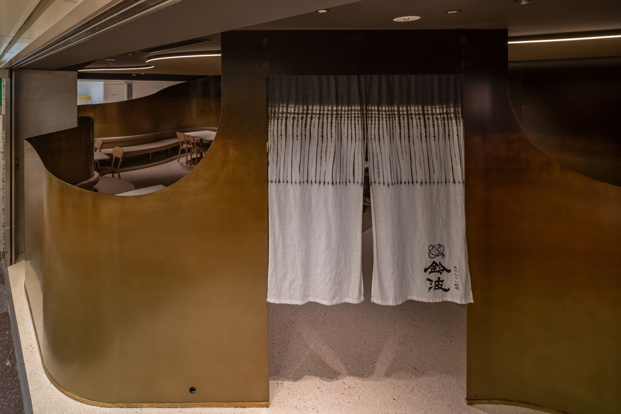 吉村靖孝とナノによる、愛知・名古屋市の「鈴波 栄 森の地下街店」。地下街の細長い区画。“上質な空間体験”を求め、高さを変えながら湾曲する“6mmの鉄板”壁で“奥行きと陰影”を創出。上がり天側に各種設備をまとめた“折上天井”として“美しい仕上げ”の水平面もつくり出す「膳処」、入口(のれんが付いた状態) photo©トロロスタジオ