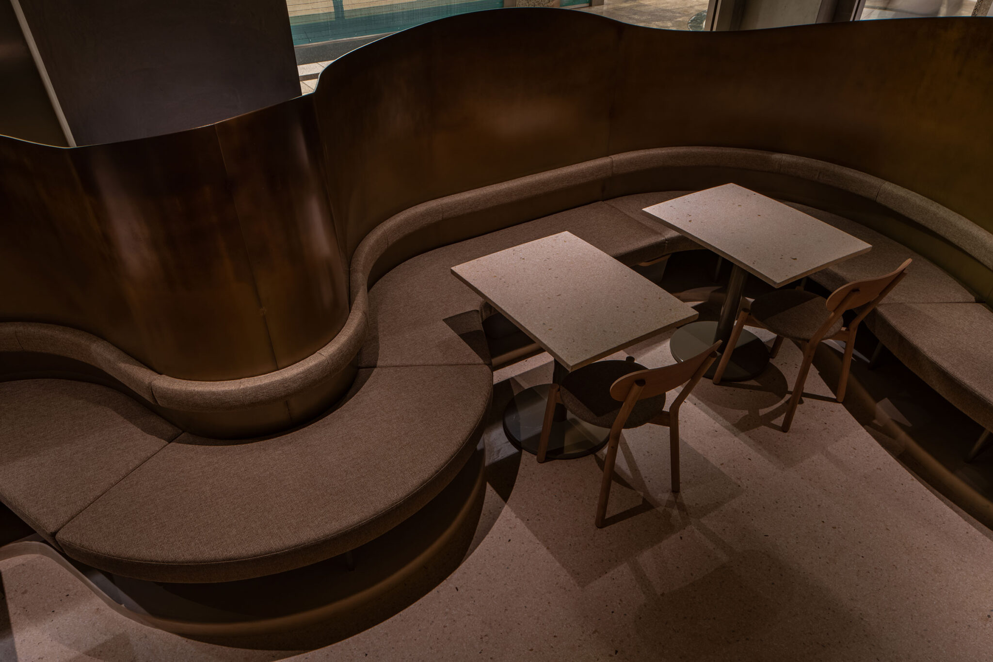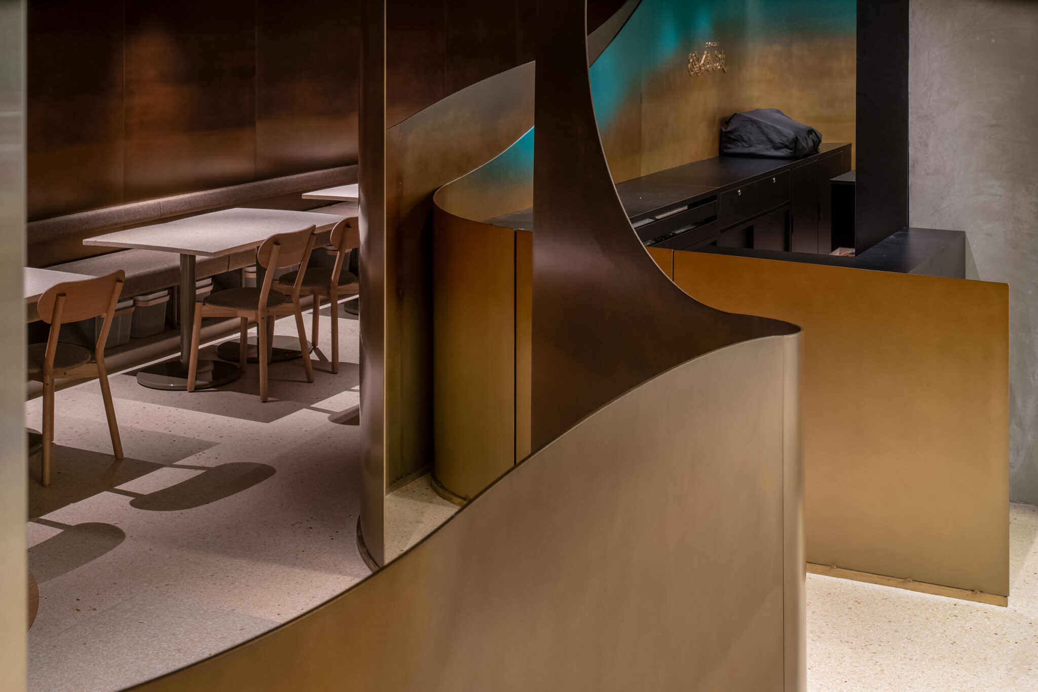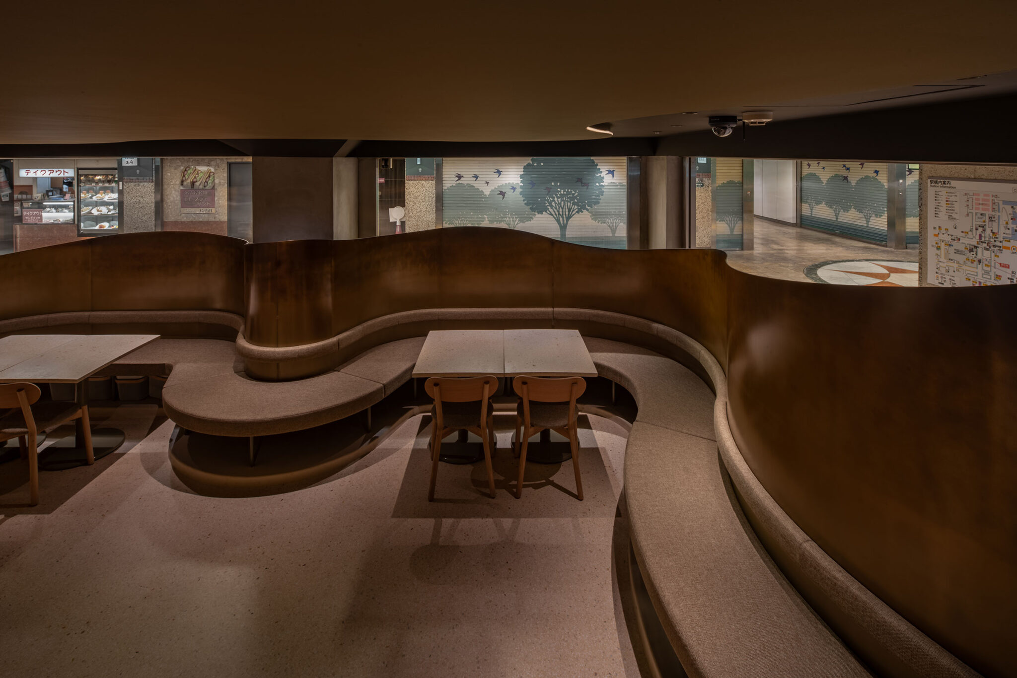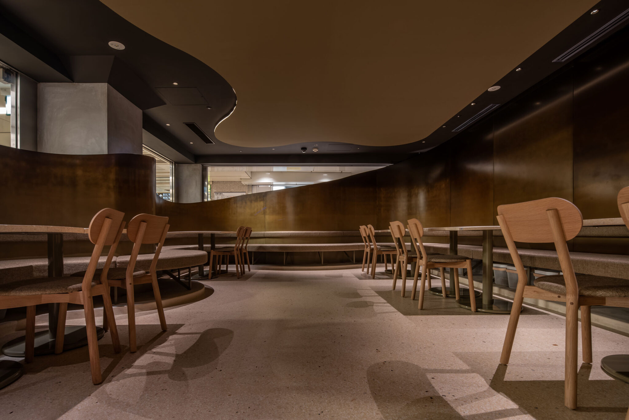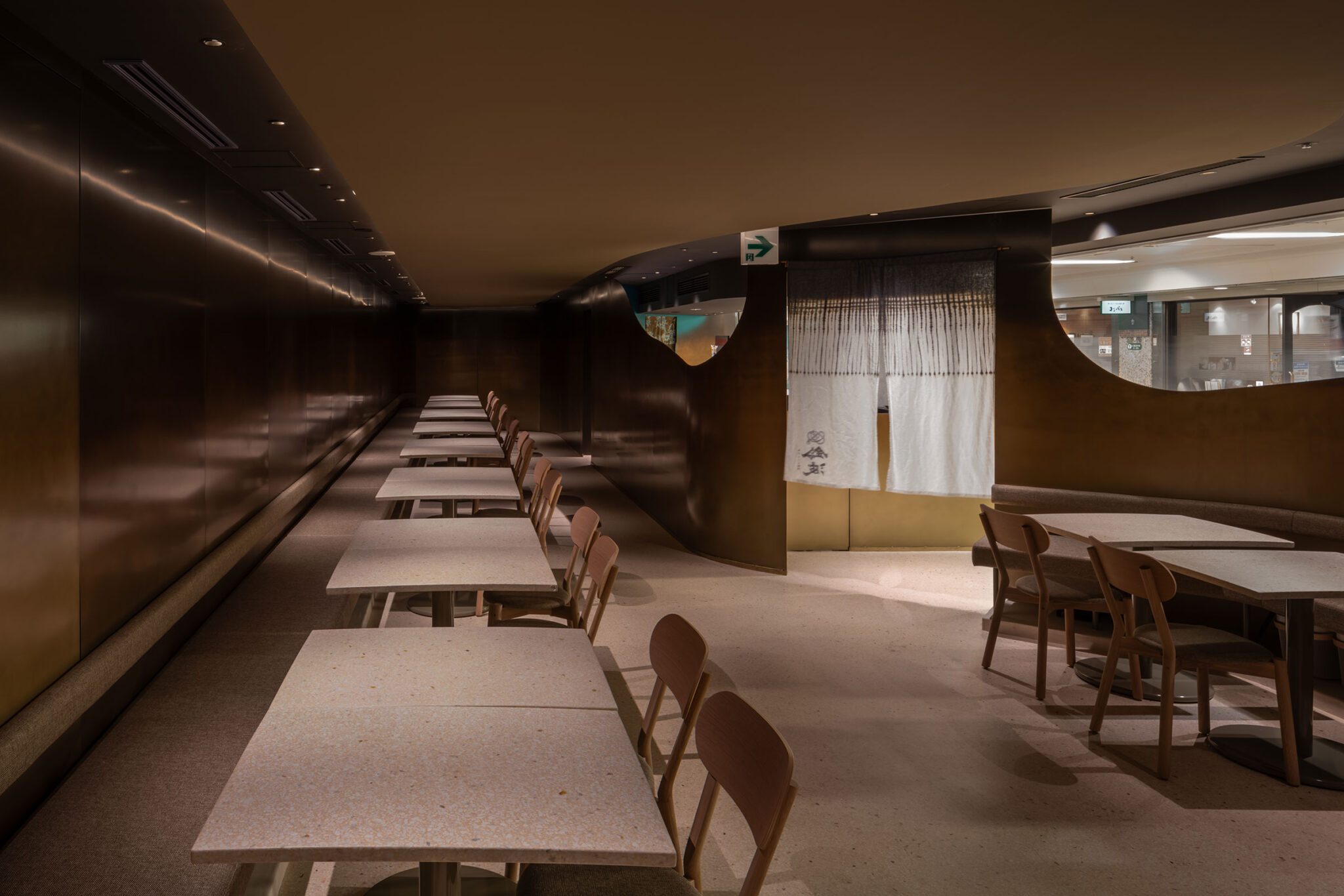 吉村靖孝とナノによる、愛知・名古屋市の「鈴波 栄 森の地下街店」。地下街の細長い区画。“上質な空間体験”を求め、高さを変えながら湾曲する“6mmの鉄板”壁で“奥行きと陰影”を創出。上がり天側に各種設備をまとめた“折上天井”として“美しい仕上げ”の水平面もつくり出す「膳処」、家具とベンチの詳細 photo©トロロスタジオ