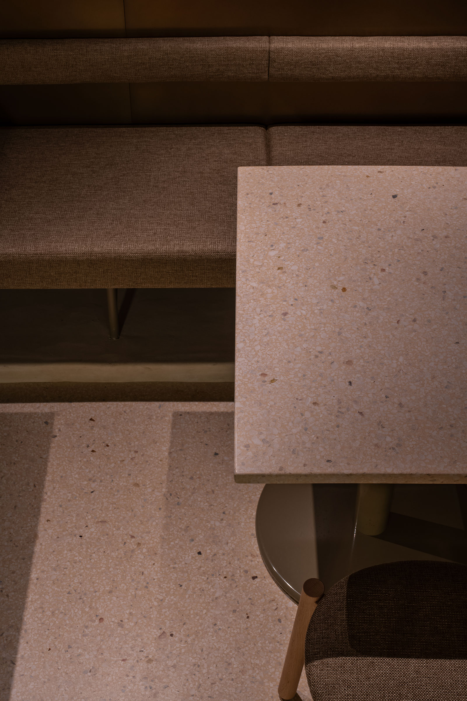 今回、壁を金属板による仕上げとしたことで、その規格により等間隔に目地が現れるため、床や天井に余計なラインが現れることは相応しくないと判断した。そこで、床は目地を必要としない特殊なテラゾー仕上げとし、天井に所狭しと設けなければならない各設備は、折上天井を設けその上がり天側に集中させ、下がり天側には一切の設備が付かない美しい仕上げとなるよう配置をコントロールした。