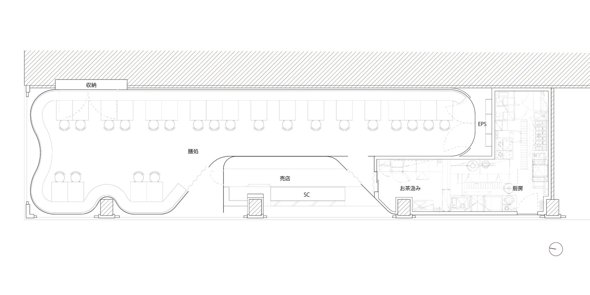 吉村靖孝とナノによる、愛知・名古屋市の「鈴波 栄 森の地下街店」。地下街の細長い区画。“上質な空間体験”を求め、高さを変えながら湾曲する“6mmの鉄板”壁で“奥行きと陰影”を創出。上がり天側に各種設備をまとめた“折上天井”として“美しい仕上げ”の水平面もつくり出す平面図 image©吉村靖孝建築設計事務所+ナノメートルアーキテクチャー