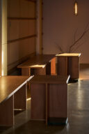 川嶋洋平建築設計事務所による、長崎・雲仙市の「THE CASE」。催し・飲食・販売を行う“多目的スペース”。気軽に交流する店主の個性を“最大限活かす”空間を求め、街と正対する様に道路側にカウンターを配置する構成を考案。一人運営を考慮して店内を一望できるようにもする家具の詳細 photo©Koji Fujii TOREAL