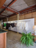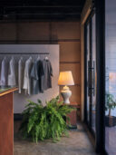 川嶋洋平建築設計事務所による、長崎・雲仙市の「THE CASE」。催し・飲食・販売を行う“多目的スペース”。気軽に交流する店主の個性を“最大限活かす”空間を求め、街と正対する様に道路側にカウンターを配置する構成を考案。一人運営を考慮して店内を一望できるようにもするカウンター側からアパレルスペースを見る。 photo©Koji Fujii TOREAL
