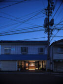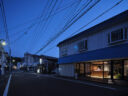 川嶋洋平建築設計事務所による、長崎・雲仙市の「THE CASE」。催し・飲食・販売を行う“多目的スペース”。気軽に交流する店主の個性を“最大限活かす”空間を求め、街と正対する様に道路側にカウンターを配置する構成を考案。一人運営を考慮して店内を一望できるようにもする東側の道路より、店舗が入る建物の外観を見る。夜景 photo©Koji Fujii TOREAL