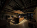 川嶋洋平建築設計事務所による、長崎・雲仙市の「THE CASE」。催し・飲食・販売を行う“多目的スペース”。気軽に交流する店主の個性を“最大限活かす”空間を求め、街と正対する様に道路側にカウンターを配置する構成を考案。一人運営を考慮して店内を一望できるようにもするエントランス側から空間全体を見る。夜景 photo©Koji Fujii TOREAL
