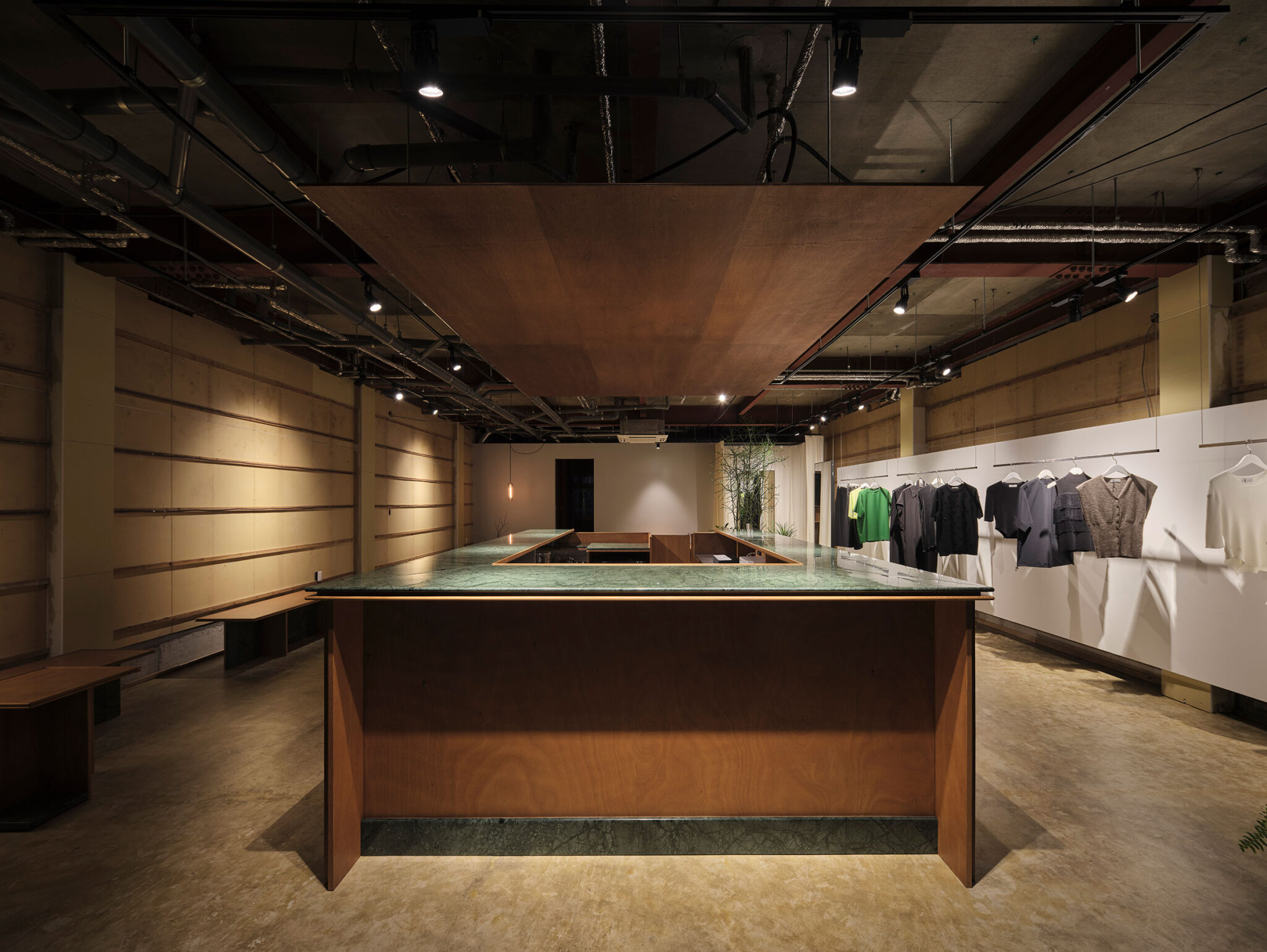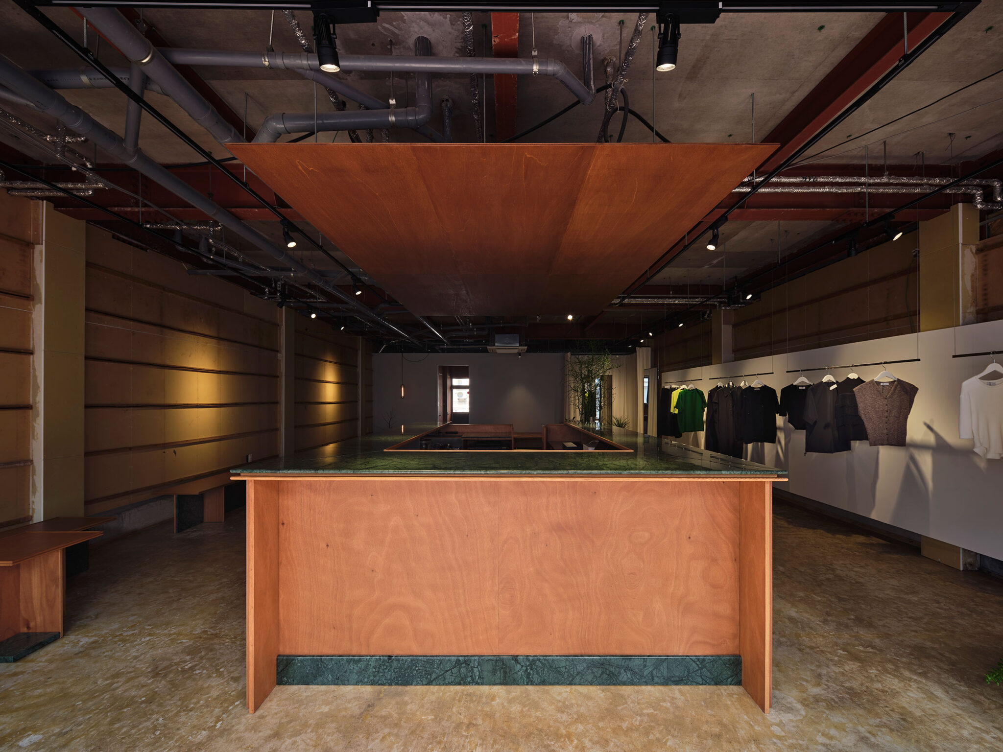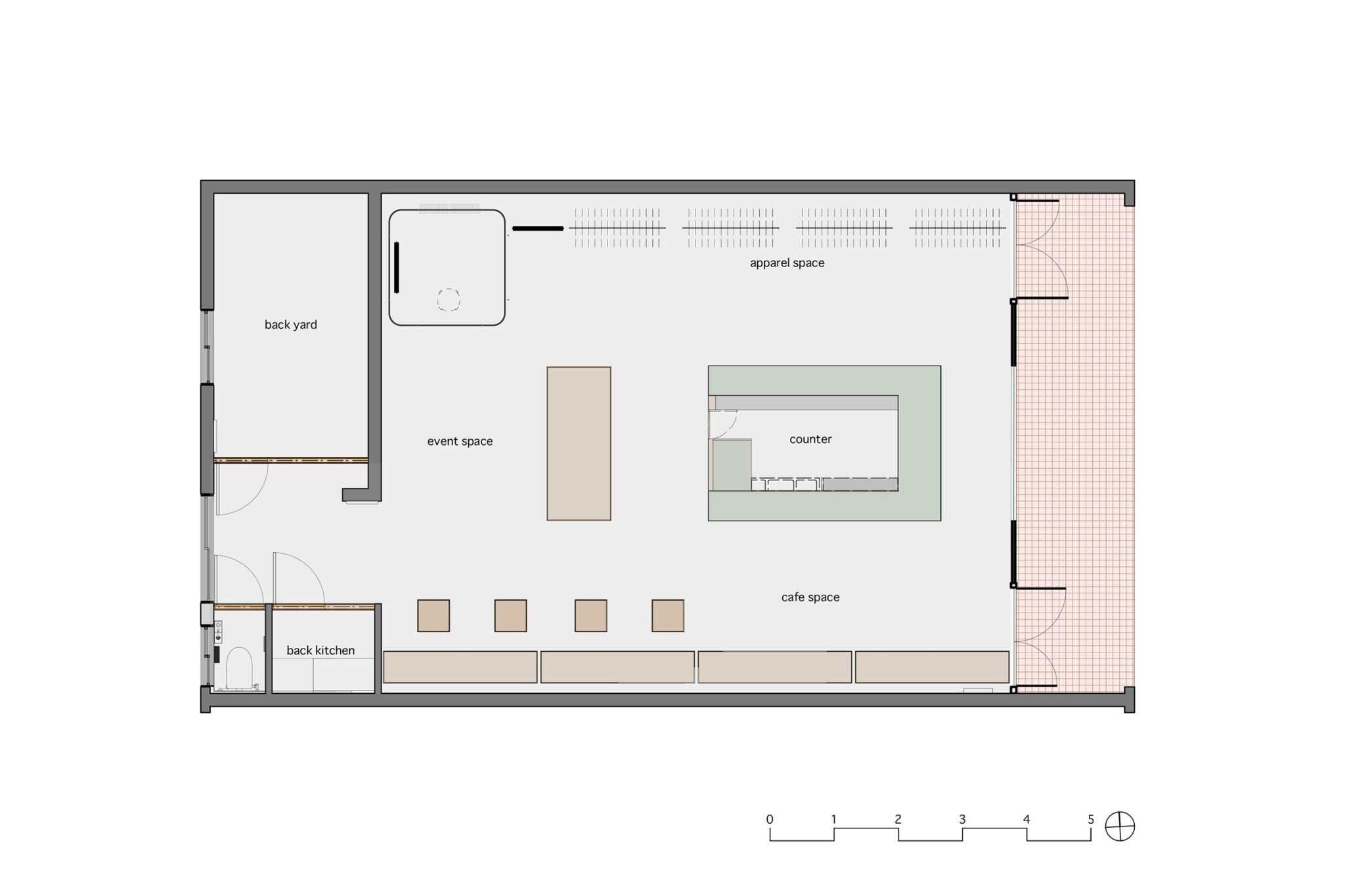 具体的には広い空間の中で大きなカウンターを前面道路側に設置して、常に街と正面に運営できるように計画しました。そして店舗全体をぐるりと見渡せるそのカウンターはカフェ機能はもちろん、アパレル区画、奥のイベントスペースも見渡せる配置として1人で空間全体を運営できるようにしました。