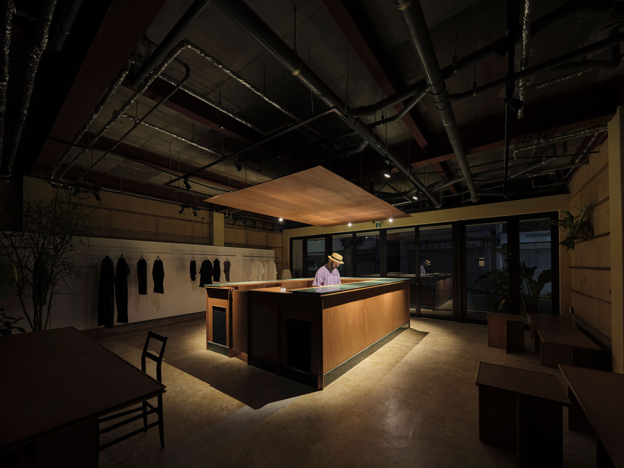 川嶋洋平建築設計事務所による、長崎・雲仙市の「THE CASE」。催し・飲食・販売を行う“多目的スペース”。気軽に交流する店主の個性を“最大限活かす”空間を求め、街と正対する様に道路側にカウンターを配置する構成を考案。一人運営を考慮して店内を一望できるようにもするカウンターからアパレルスペースを見る、夕景 photo©Koji Fujii TOREAL