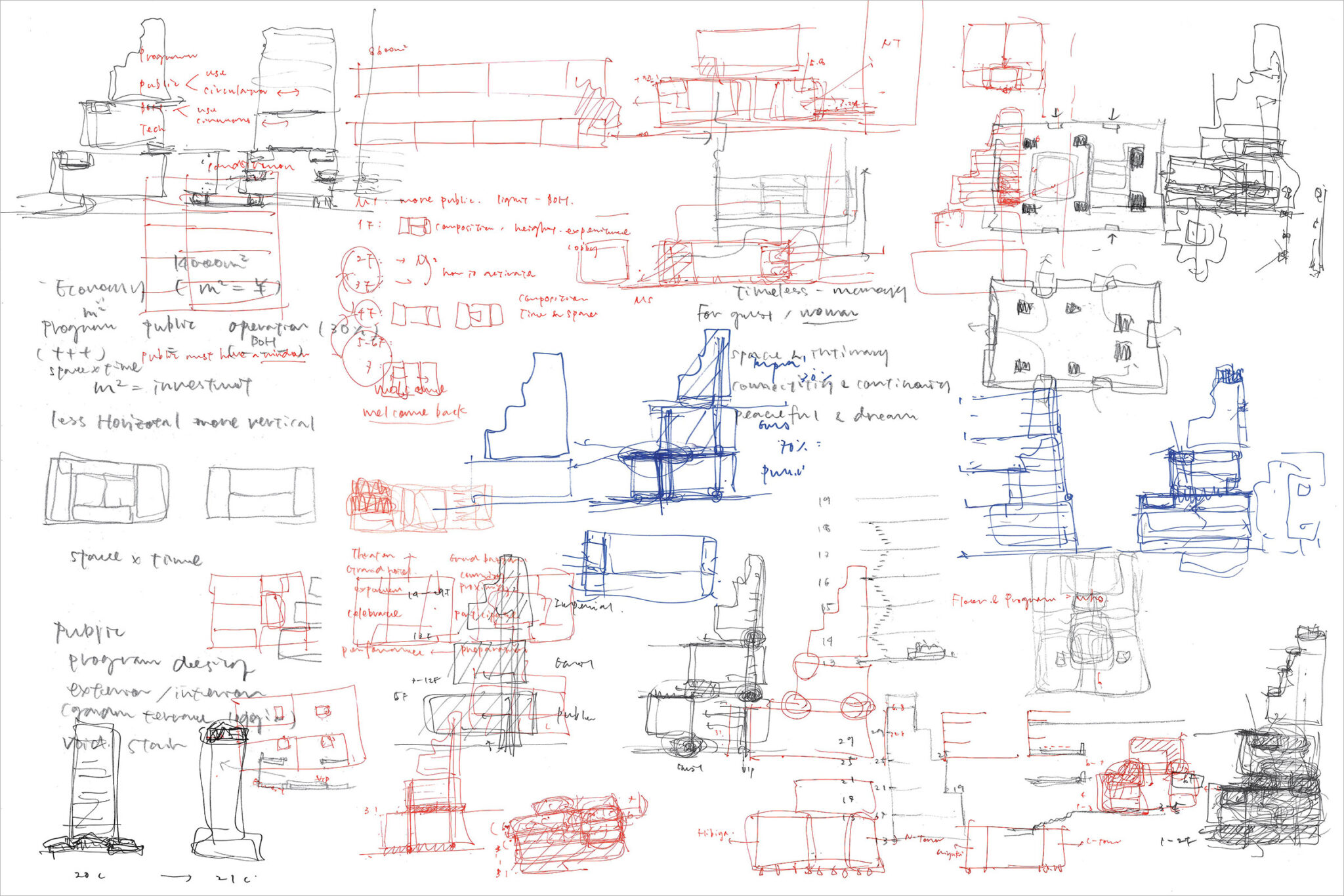 続く「コンセプト」では、各プロジェクトの背景となる思考やリサーチを紹介し、「ドローイング」では、設計過程を支える図面を通して、建築が立ち上がるプロセスをより具体的に可視化します。各プロジェクトは、敷地や地域に内在する「場所の記憶」を読み解くリサーチから始まり、そこから生まれる問い、コンセプト、設計の展開が、写真・図面・ドローイングによって立体的に示されます。