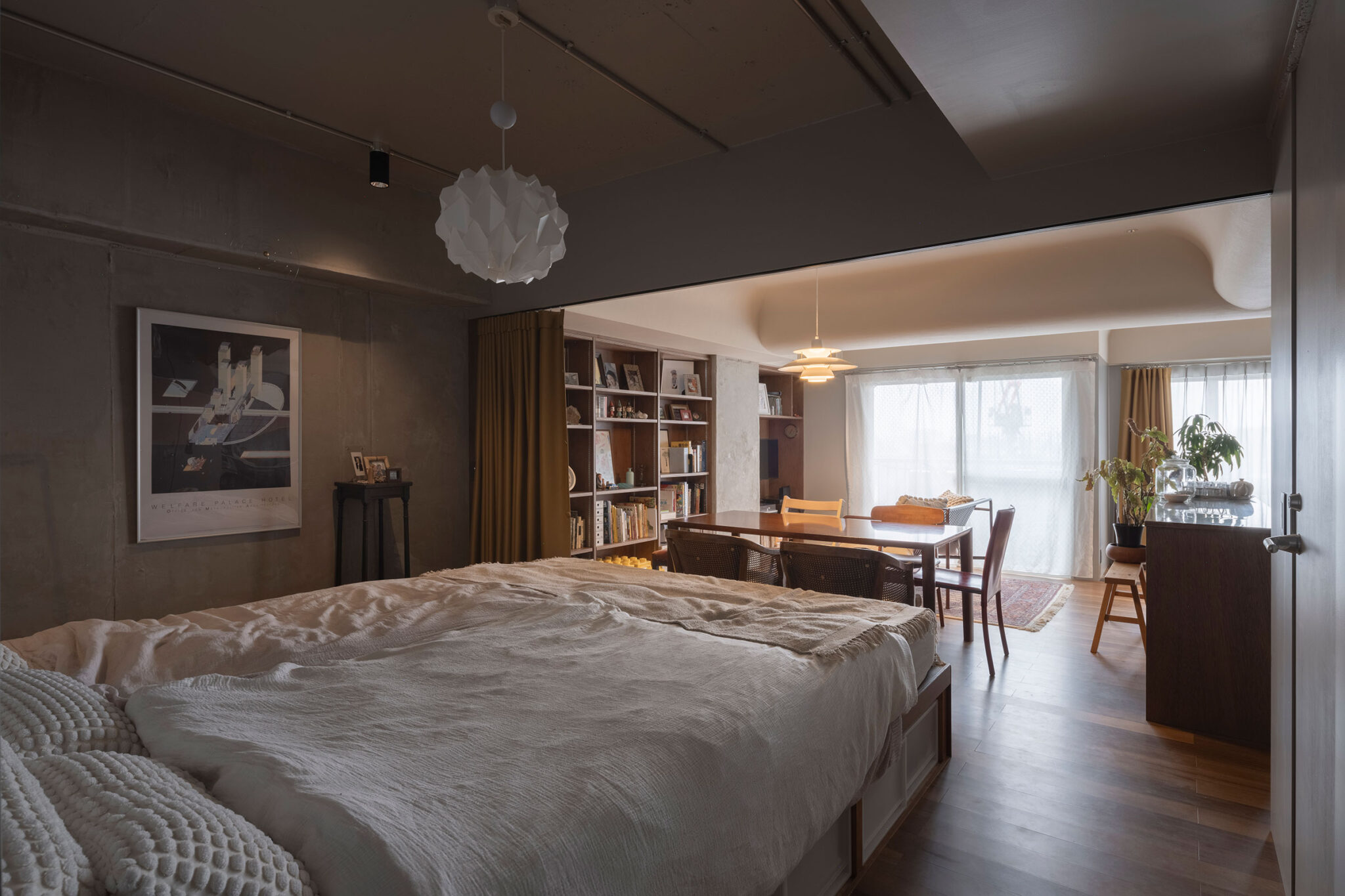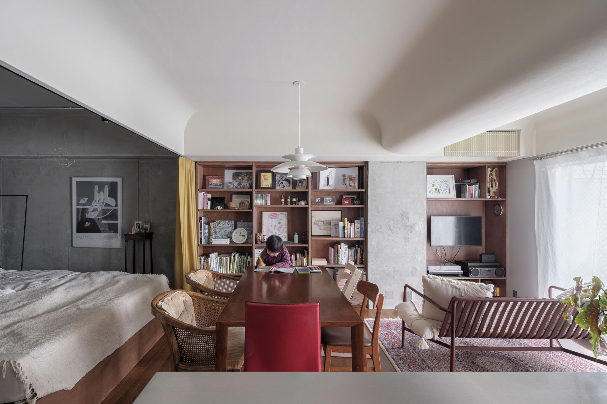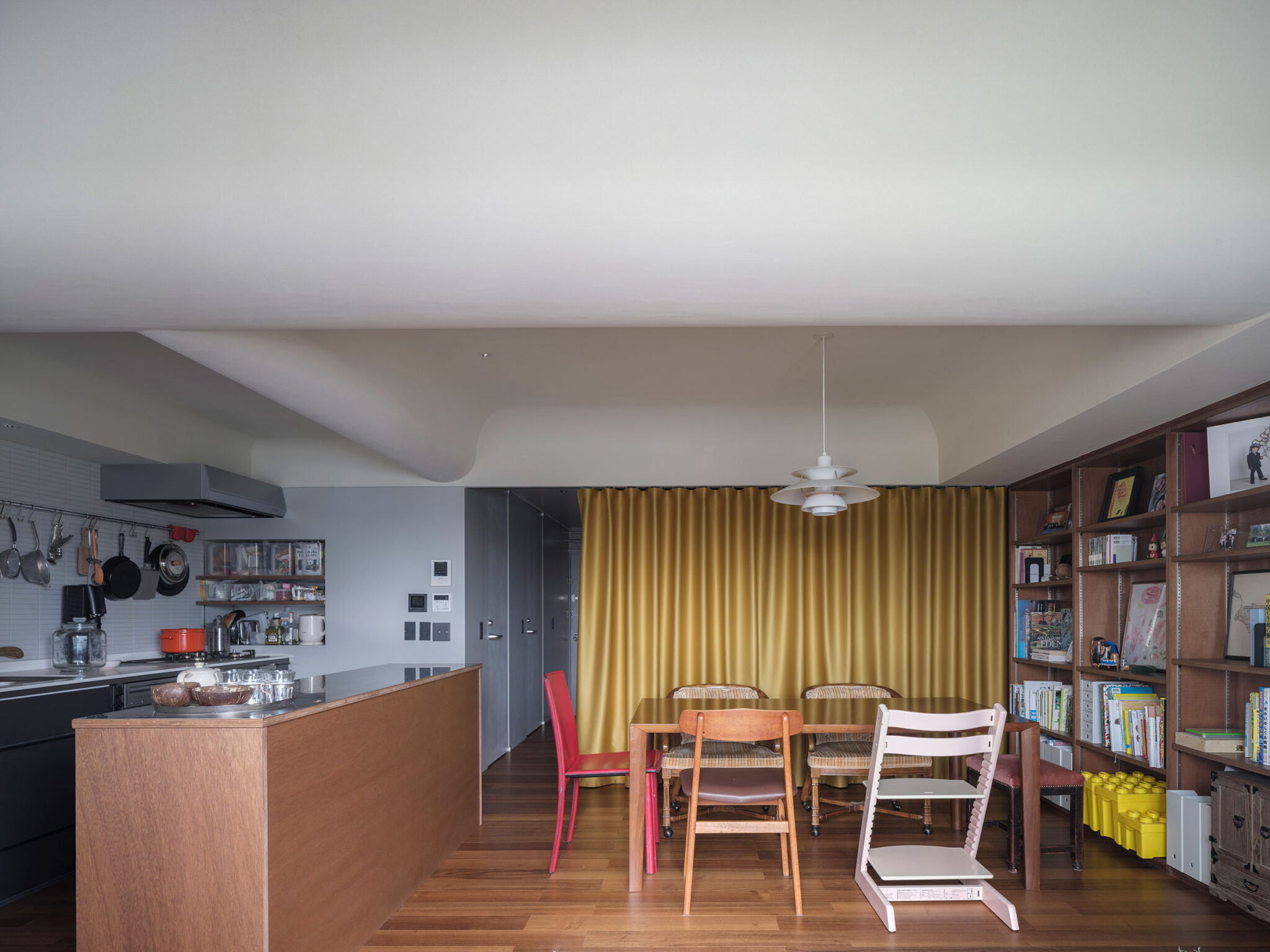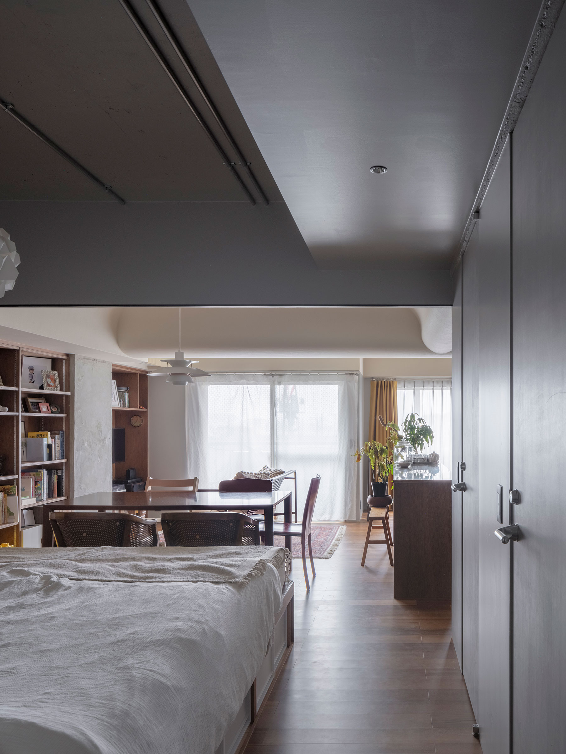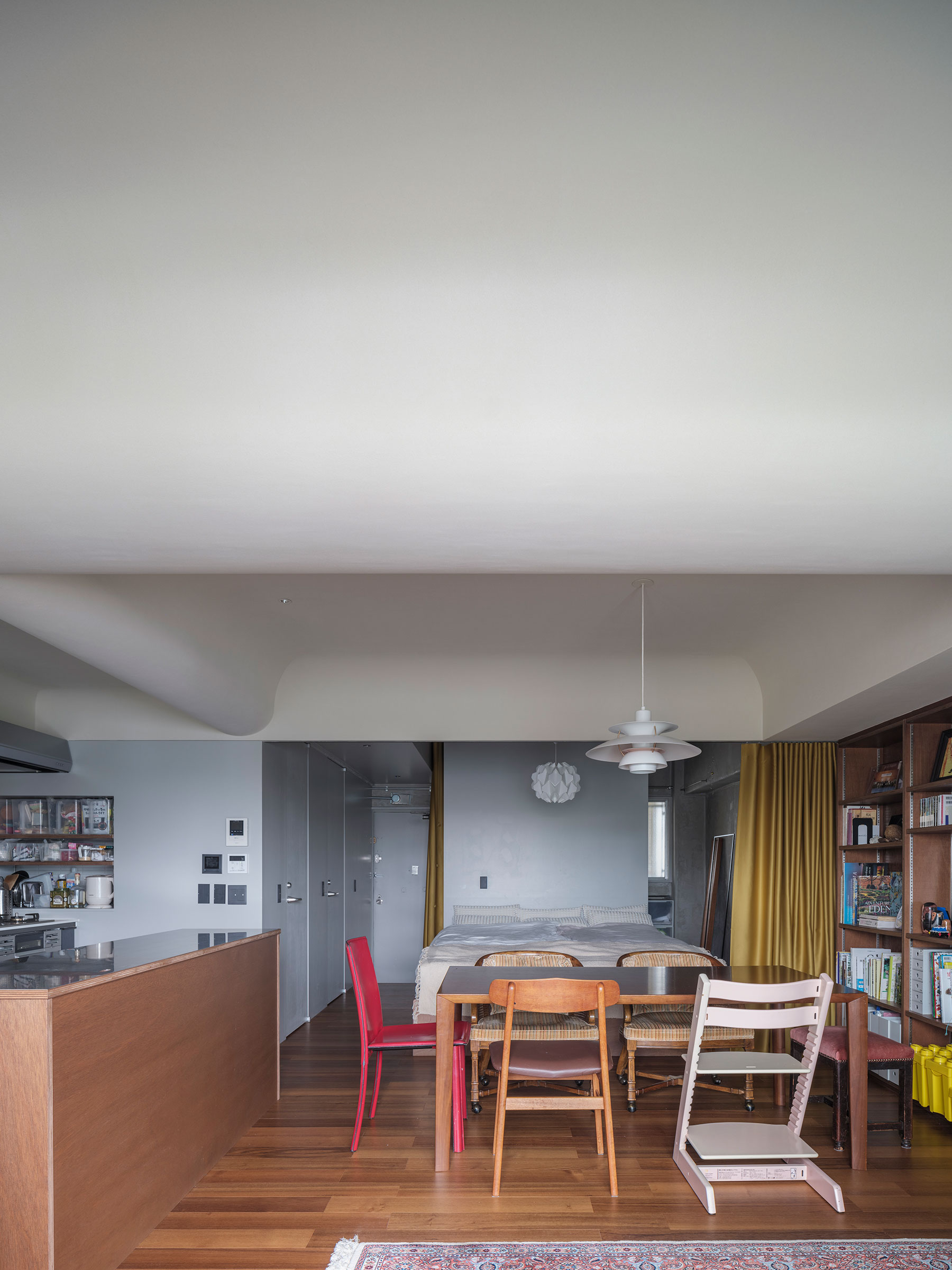 T/Hによる、東京・杉並区の「高円寺の住戸」。長く海外で暮らした施主家族の為に計画。本来必要な広さと日本の狭い住環境の“ずれ”の解消を求め、“実際よりも柔らかな広がり”を生む空間を志向。左官材で“隅をつぶすように滑らかな曲面”で繋いだ天井を考案リビングからダイニング越しにベッドスペース側を見る。(カーテンを閉めた状態) photo©福田駿