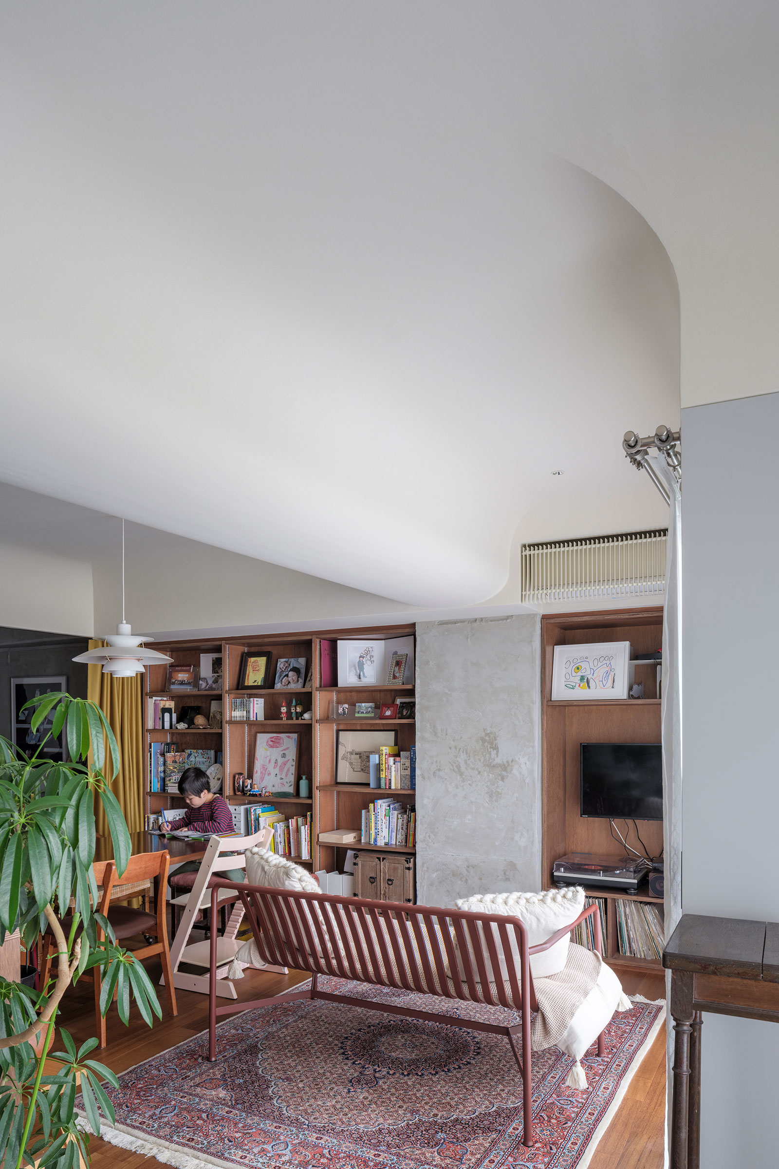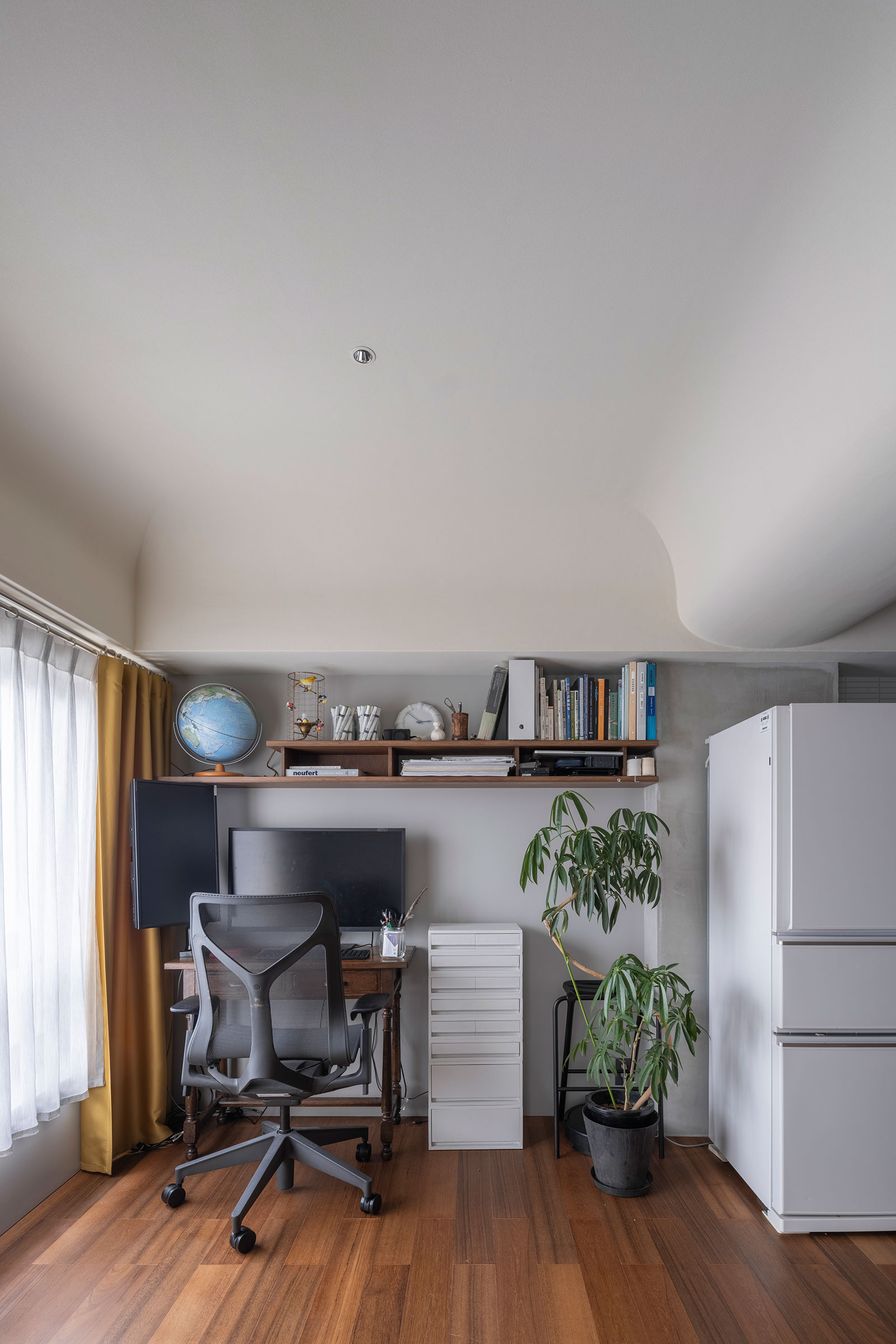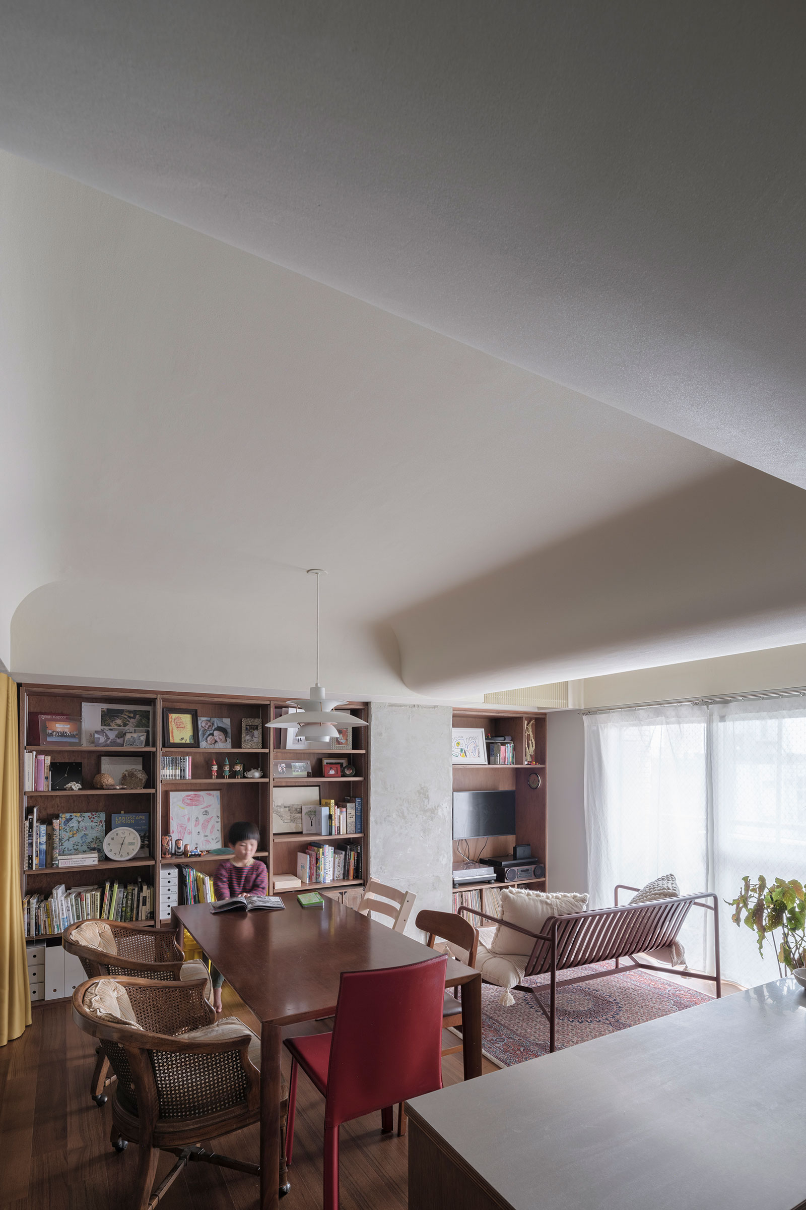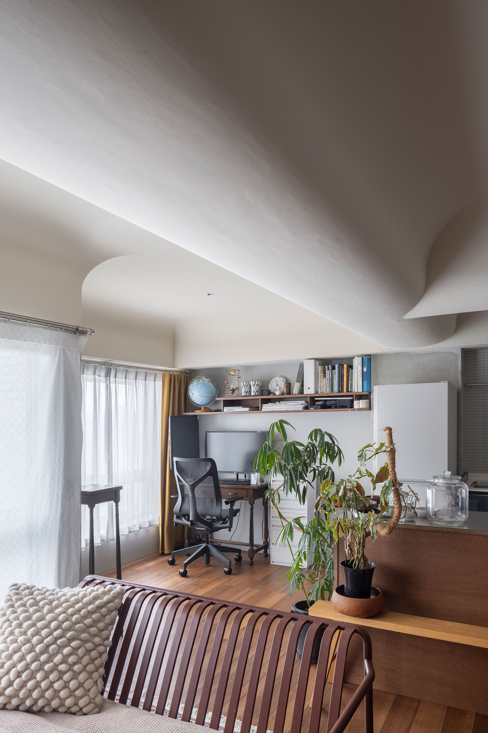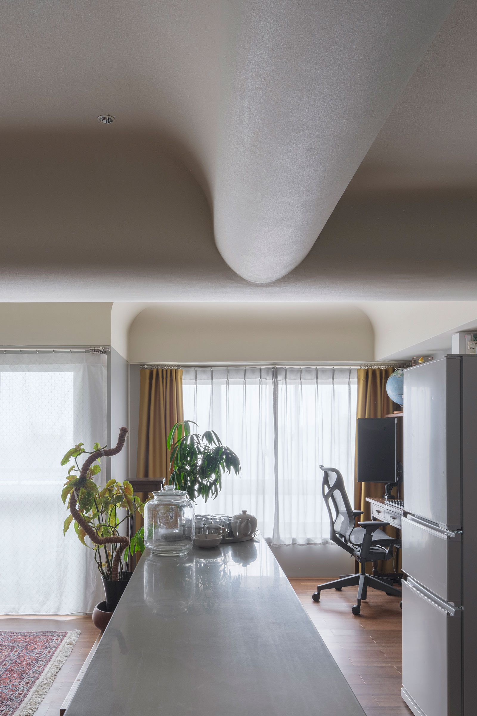 T/Hによる、東京・杉並区の「高円寺の住戸」。長く海外で暮らした施主家族の為に計画。本来必要な広さと日本の狭い住環境の“ずれ”の解消を求め、“実際よりも柔らかな広がり”を生む空間を志向。左官材で“隅をつぶすように滑らかな曲面”で繋いだ天井を考案リビングからデスク側を見る。 photo©福田駿