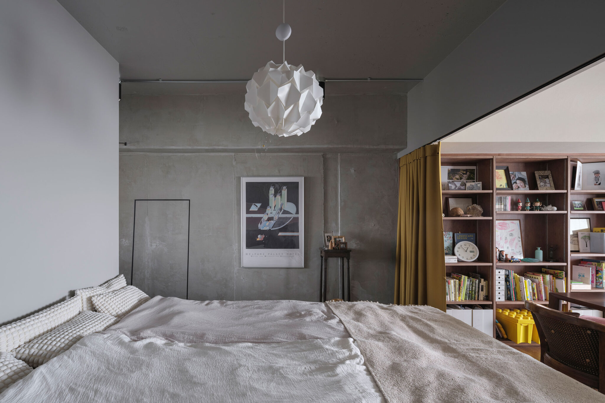 色の差のない壁のエッジは曖昧となってひと連なりに広がっていく。途中、LDKと寝室の境は厚い生地のカーテンを設え、生活の変化に対して、可変的でおおらかに暮らせるようになっている。