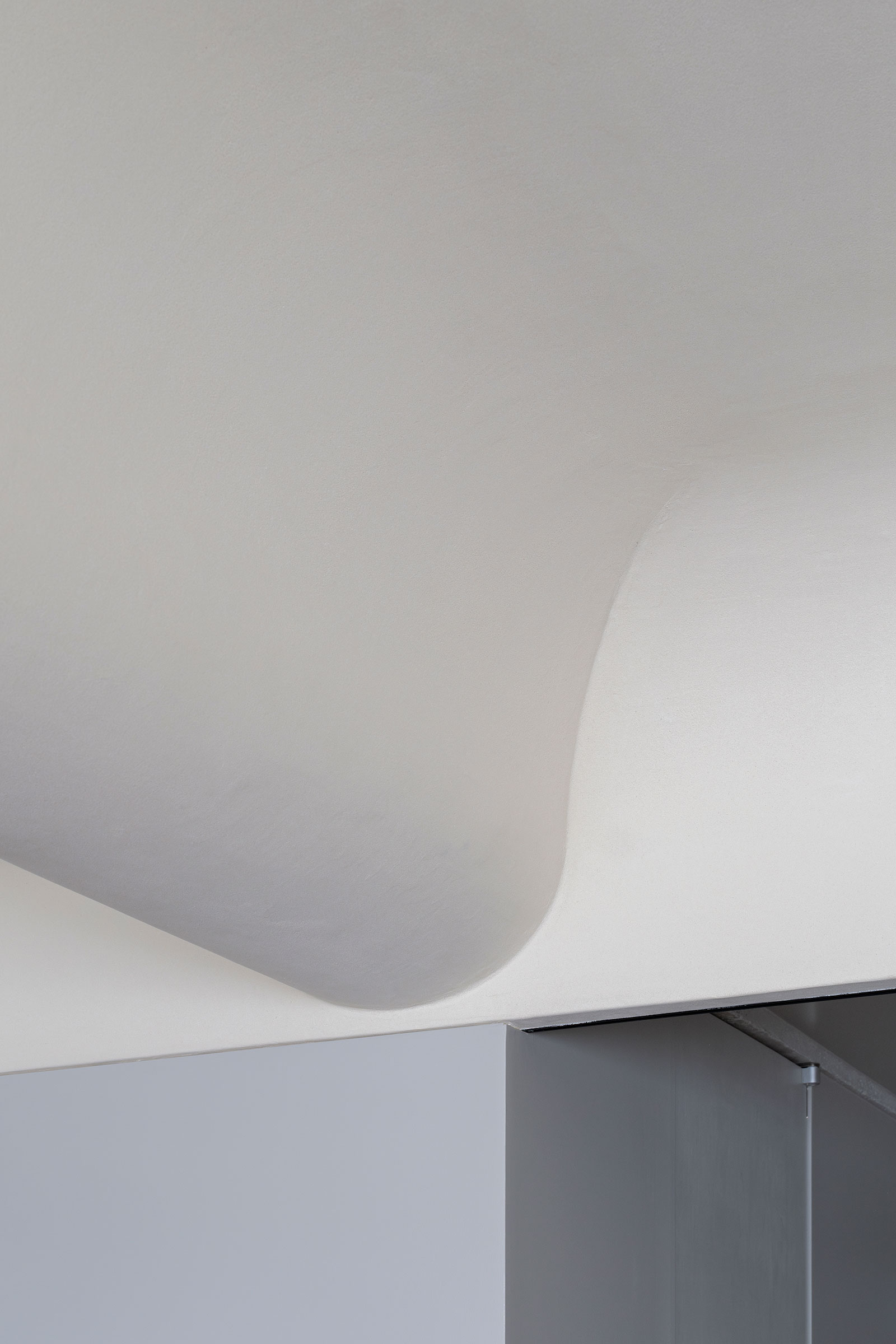 具体的には、背丈より上の部分を、隅をつぶすように滑らかな曲面でつなぐ。光を受けた砂状の左官材は面を細かな点に砕き、天井と壁というよりは、ぼんやりとした曇り空のようにも見える。奥行きが良く分からなくなり、感覚的な天井を押し上げている。