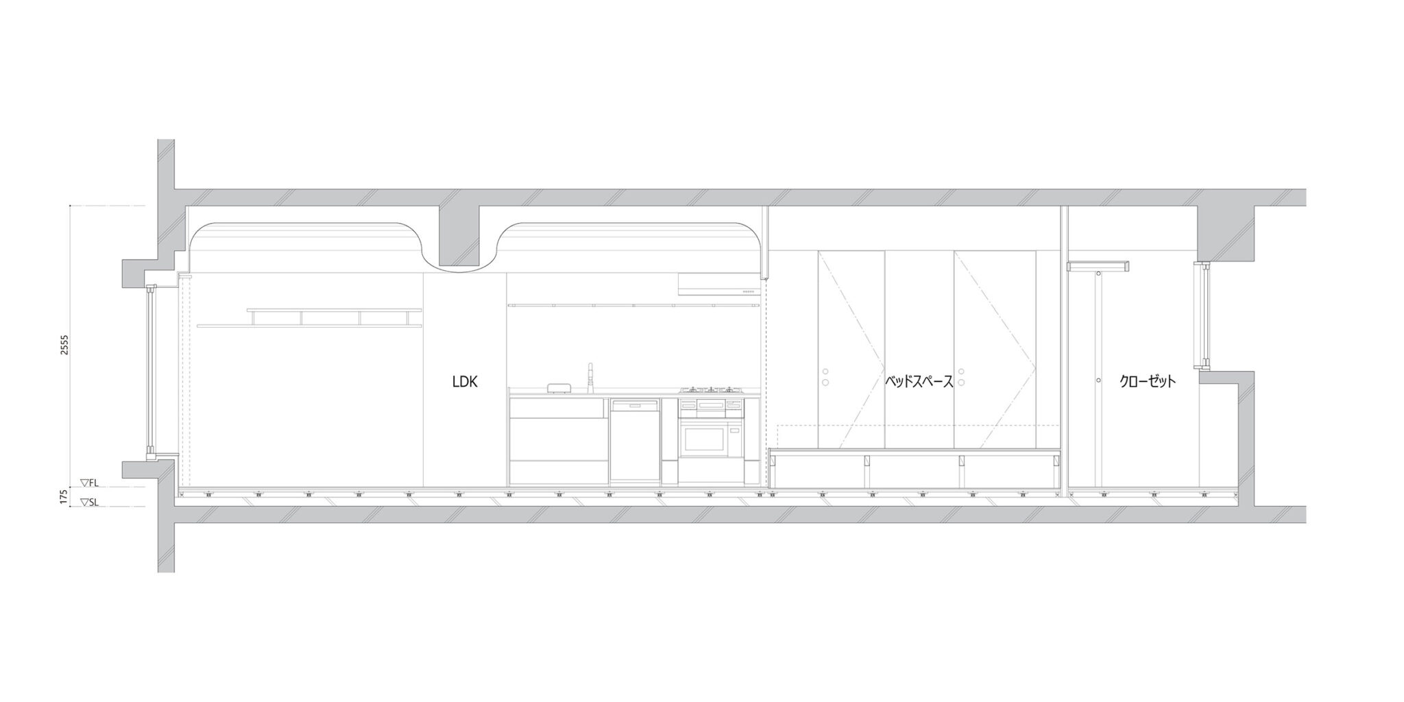 T/Hによる、東京・杉並区の「高円寺の住戸」。長く海外で暮らした施主家族の為に計画。本来必要な広さと日本の狭い住環境の“ずれ”の解消を求め、“実際よりも柔らかな広がり”を生む空間を志向。左官材で“隅をつぶすように滑らかな曲面”で繋いだ天井を考案断面図 image©T/H