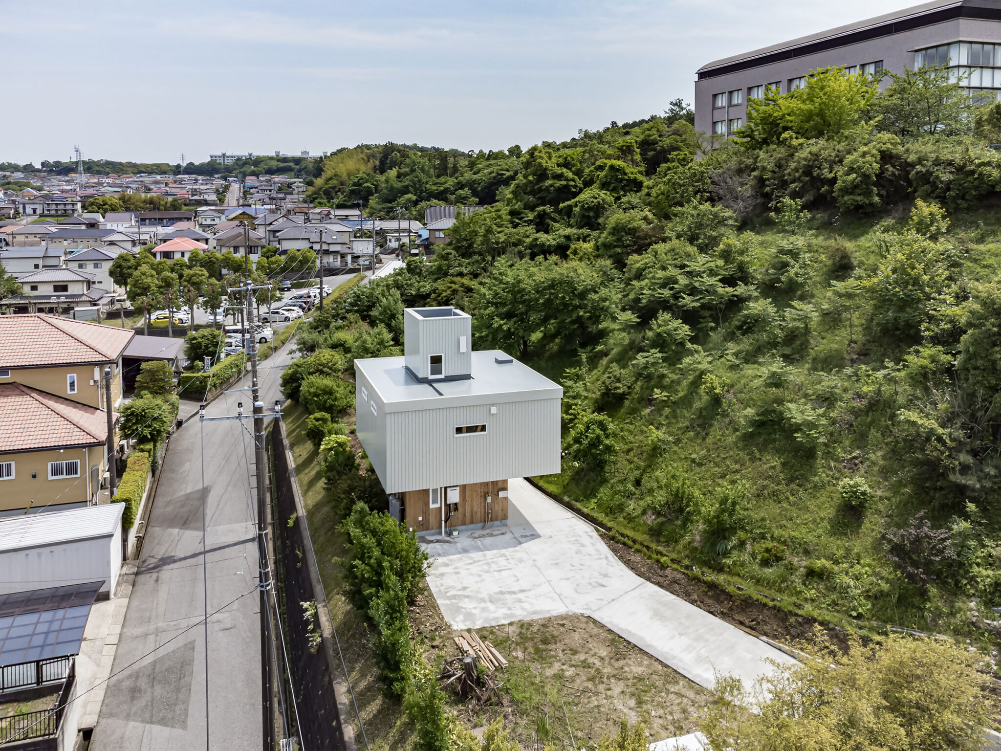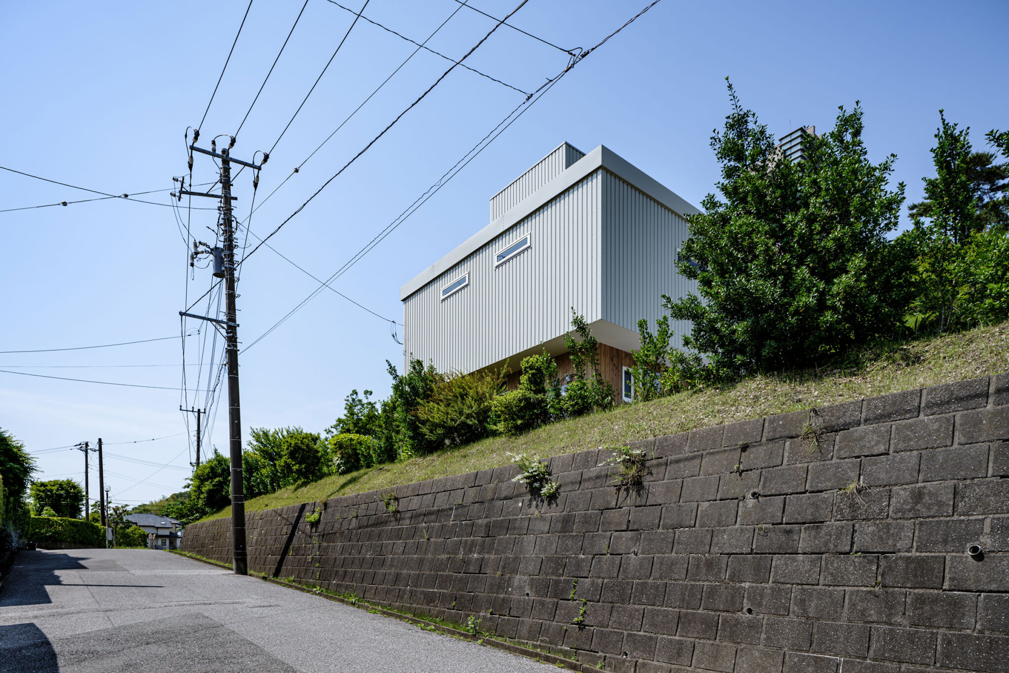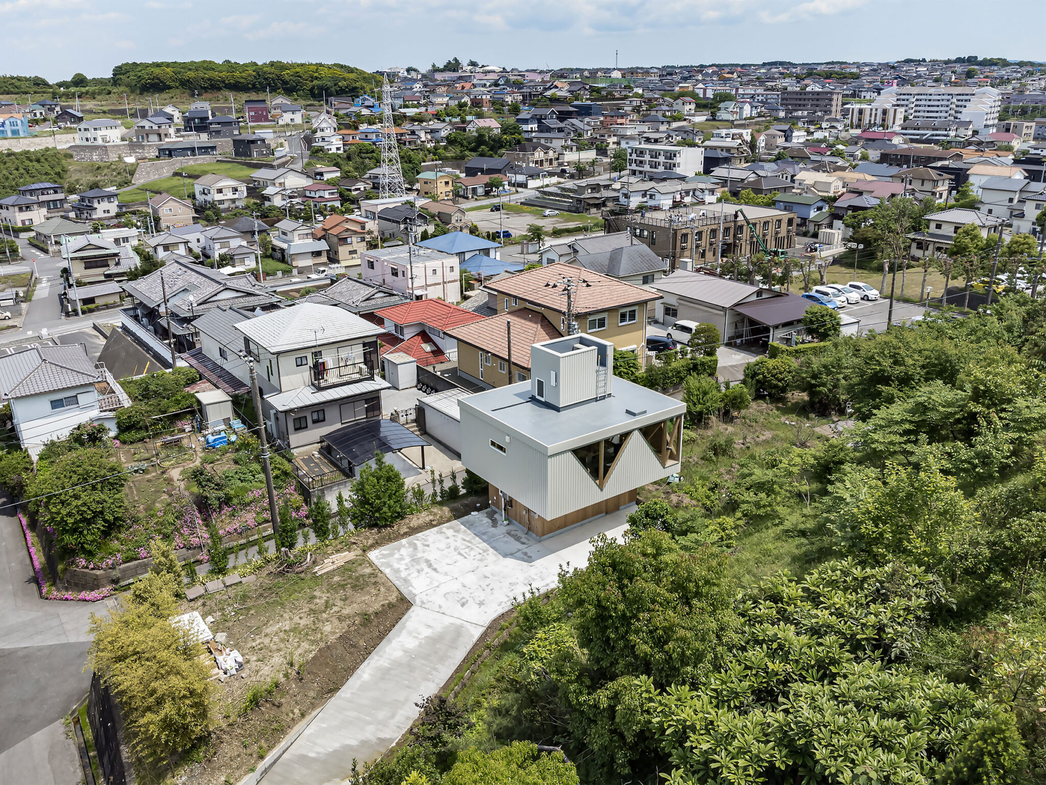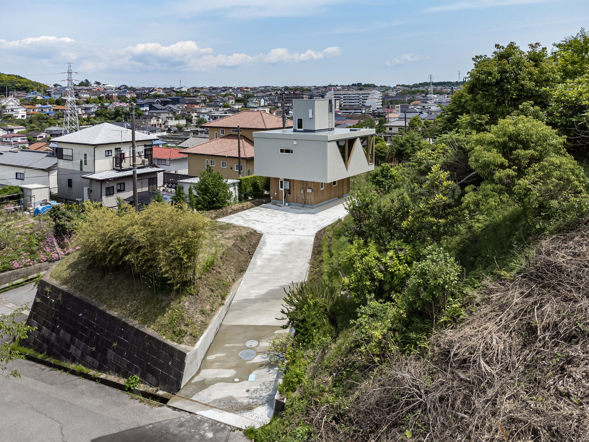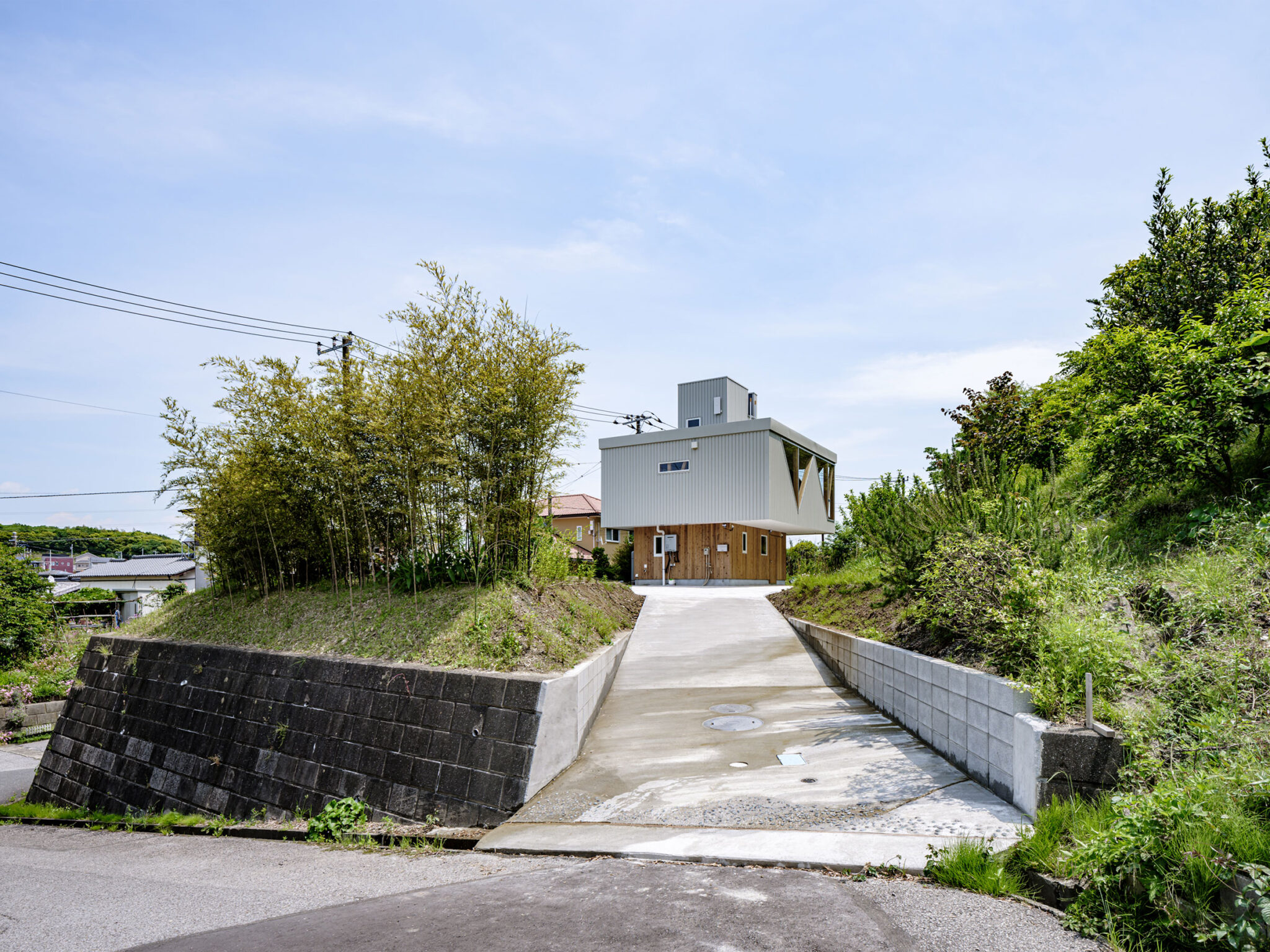 この住宅は千葉県木更津市内、ひな壇に分譲された戸建団地の際で斜面を背負った敷地に建っています。