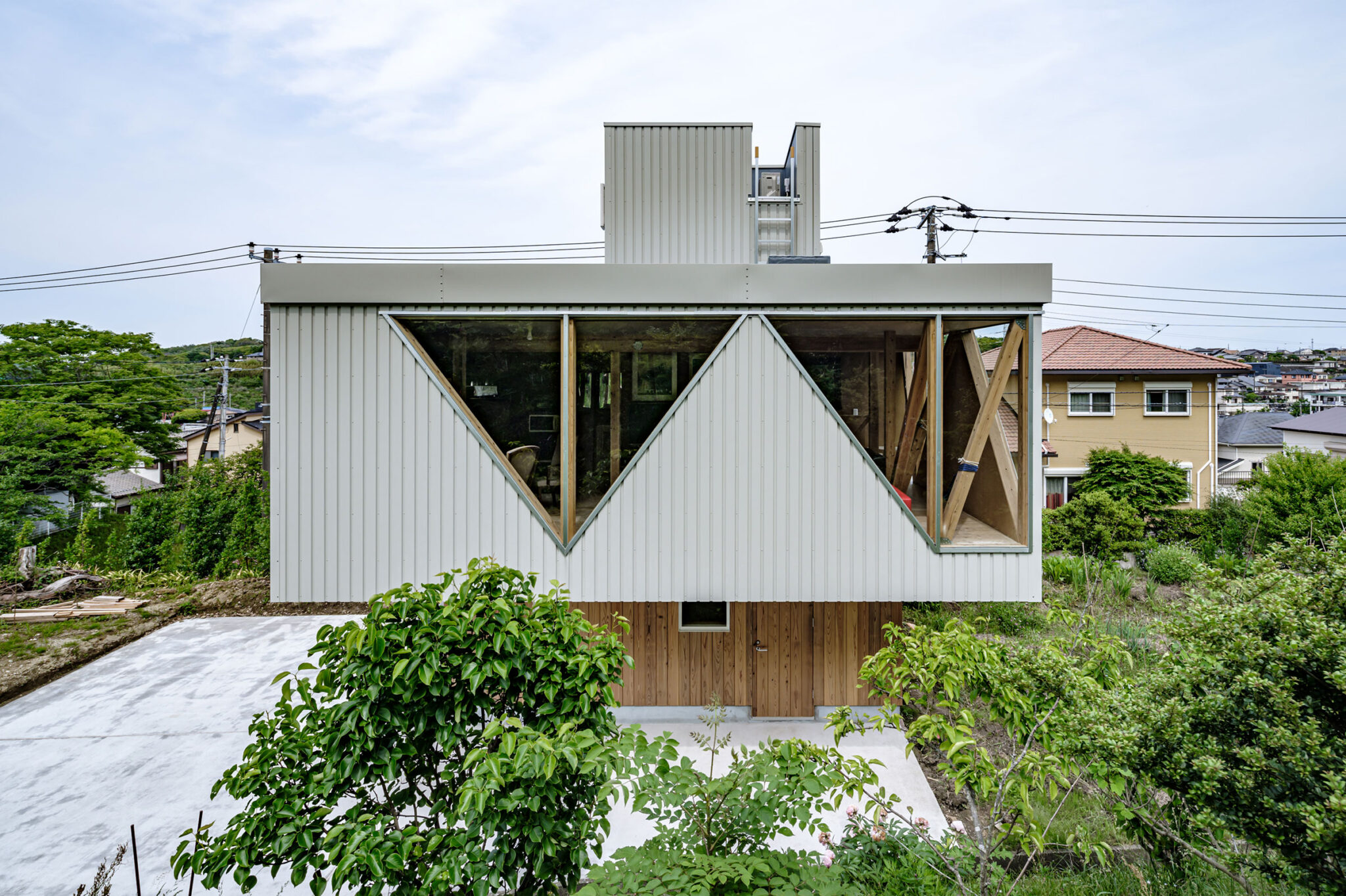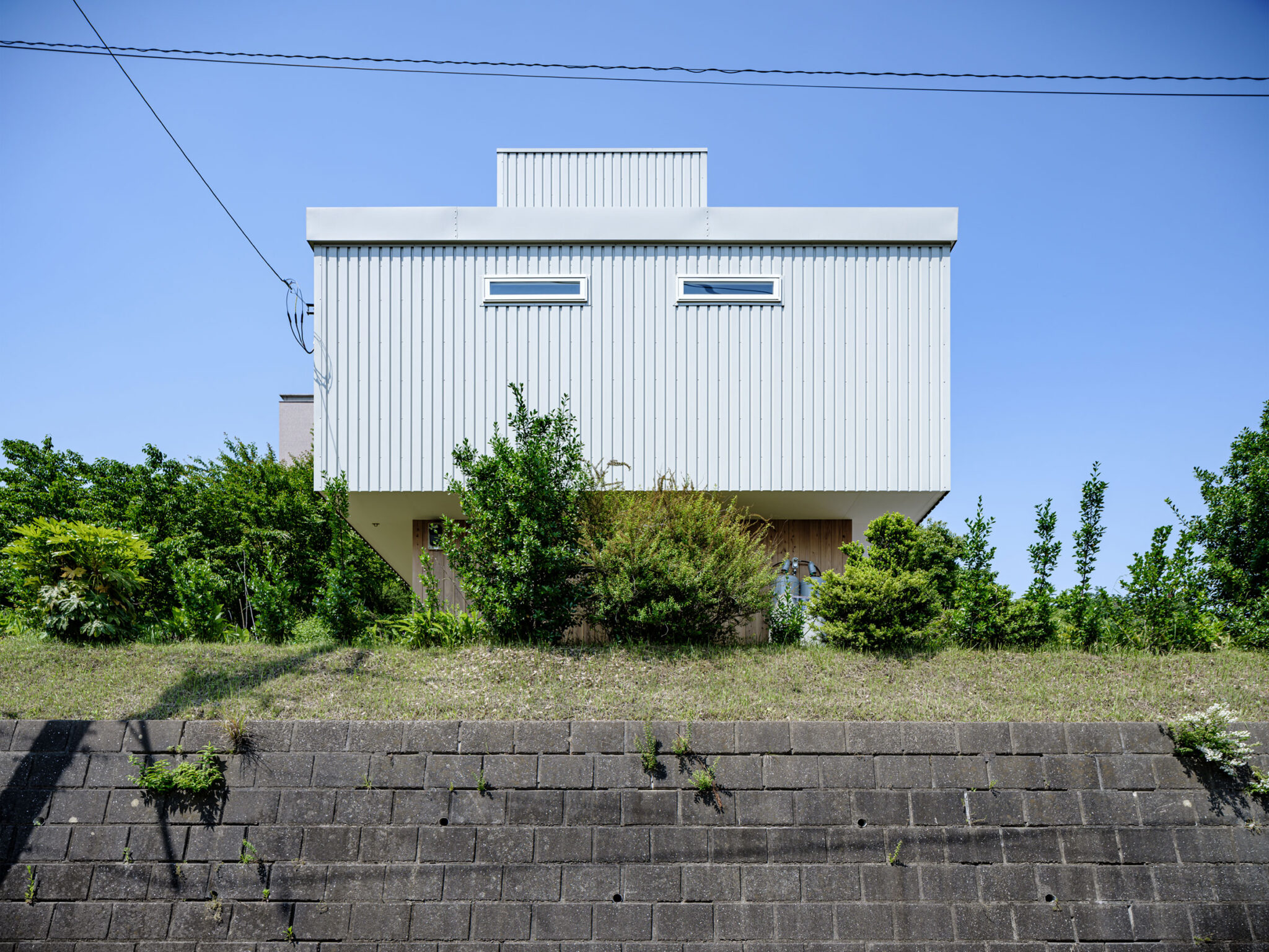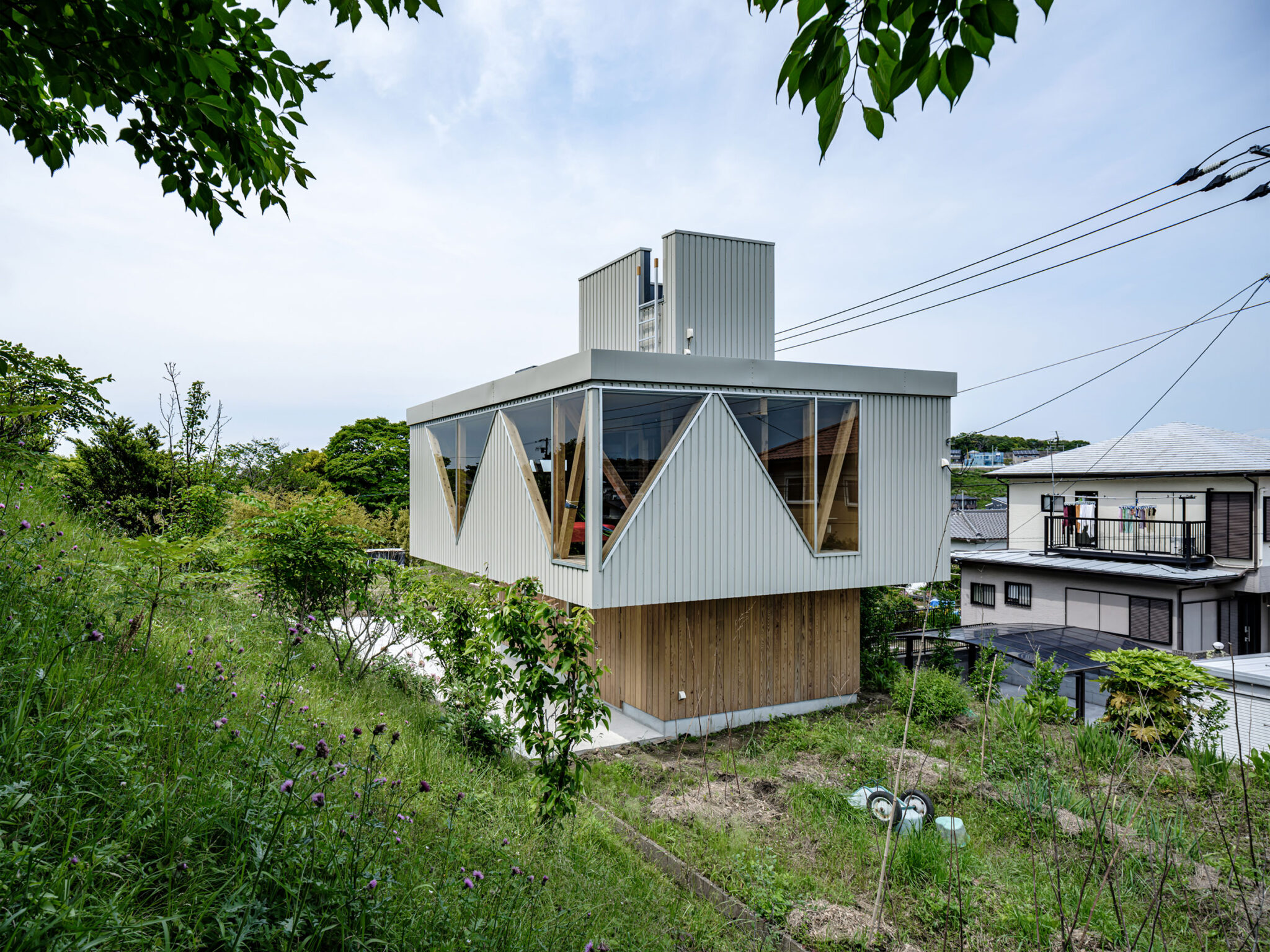 kurosawa kawara-tenによる、千葉・木更津市の「Gさんのための家」。施主が手入れを続けてきた敷地での計画。望む建築を共に探る対話のプロセスを試み、“のびやか”だか“草花を守る為に大きな建物は避ける”という思いを発見。1階面積を抑えて2階部分を大きく跳ね出す建築を考案屋根 photo©千葉正人