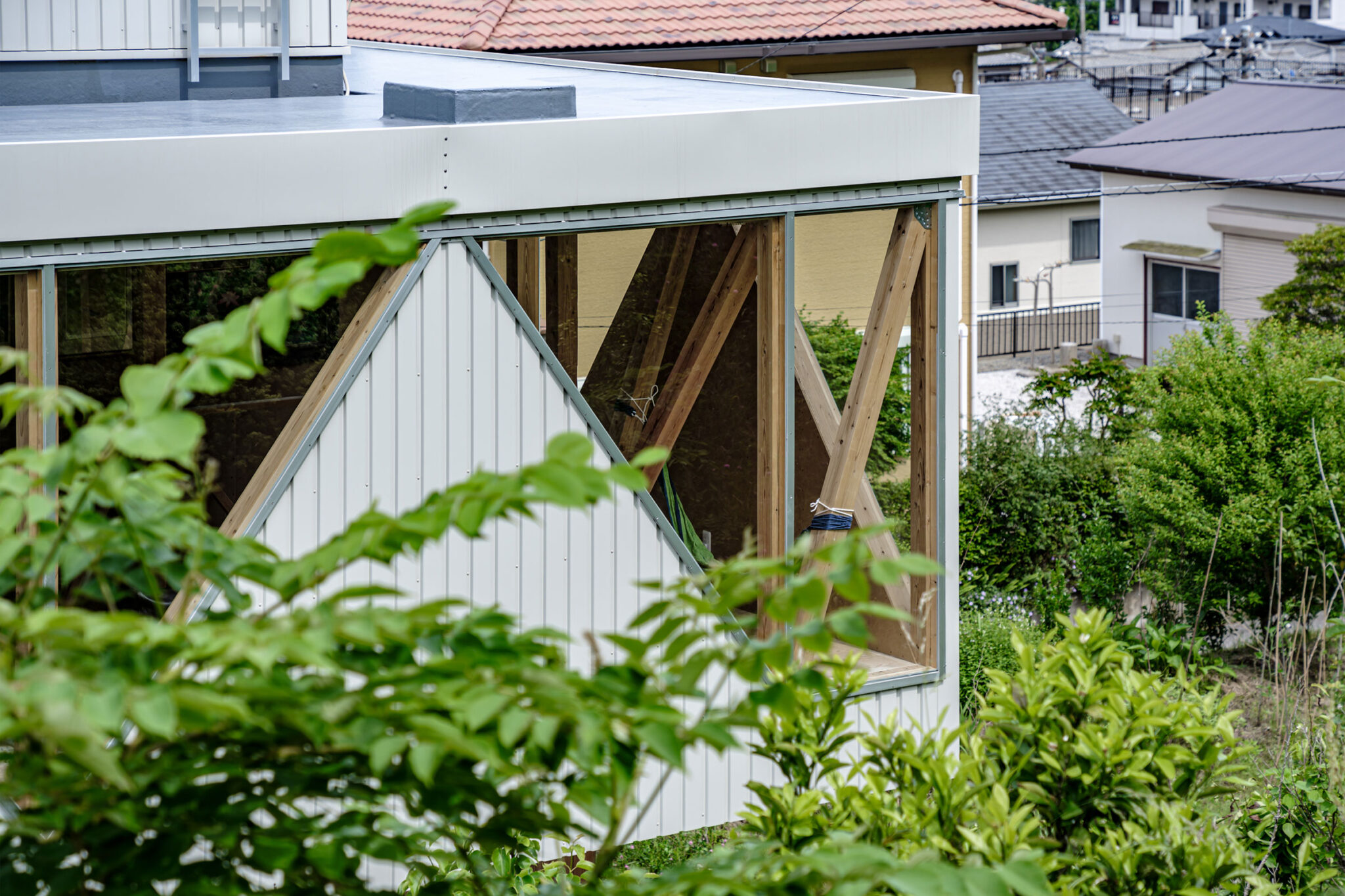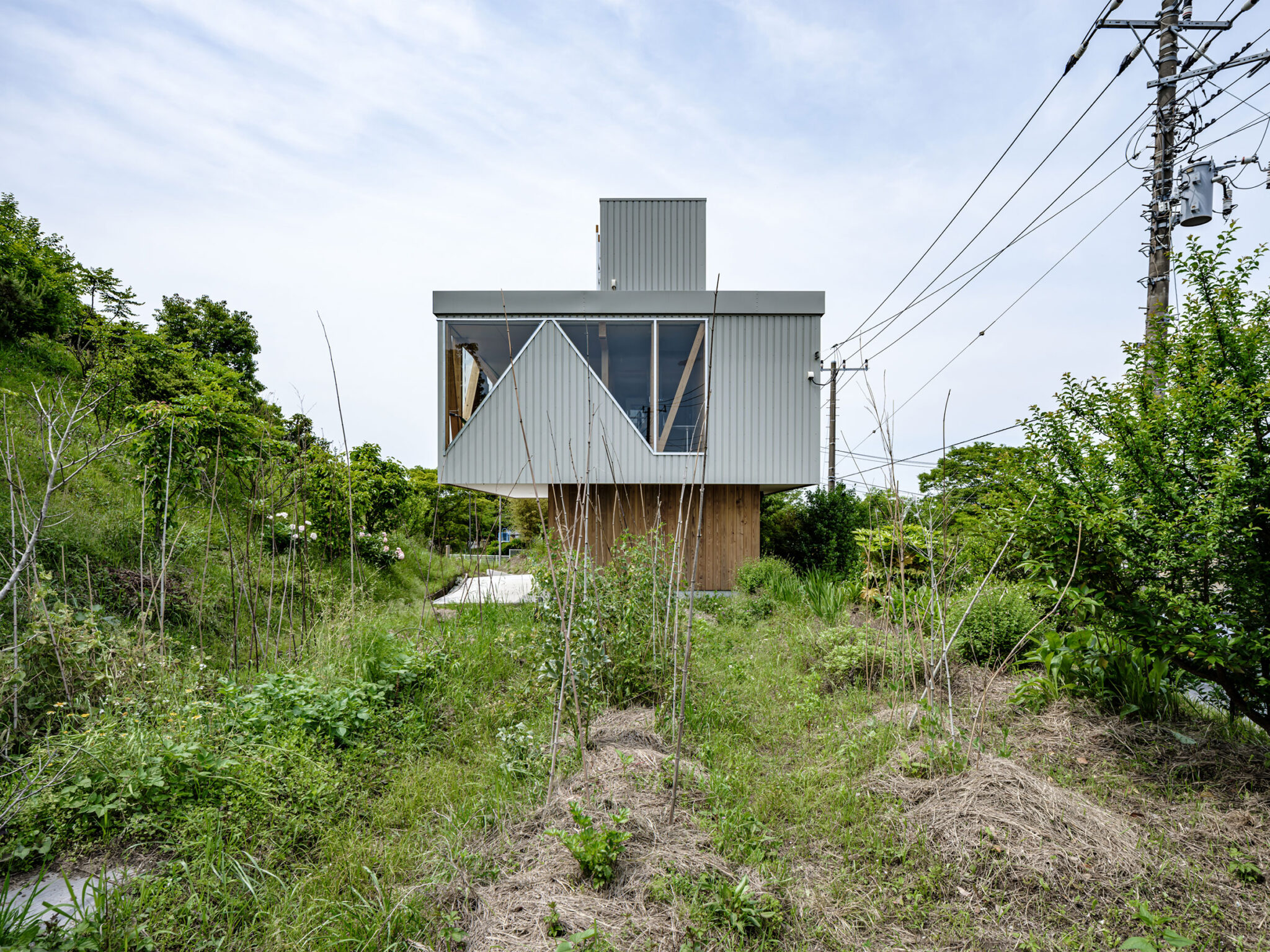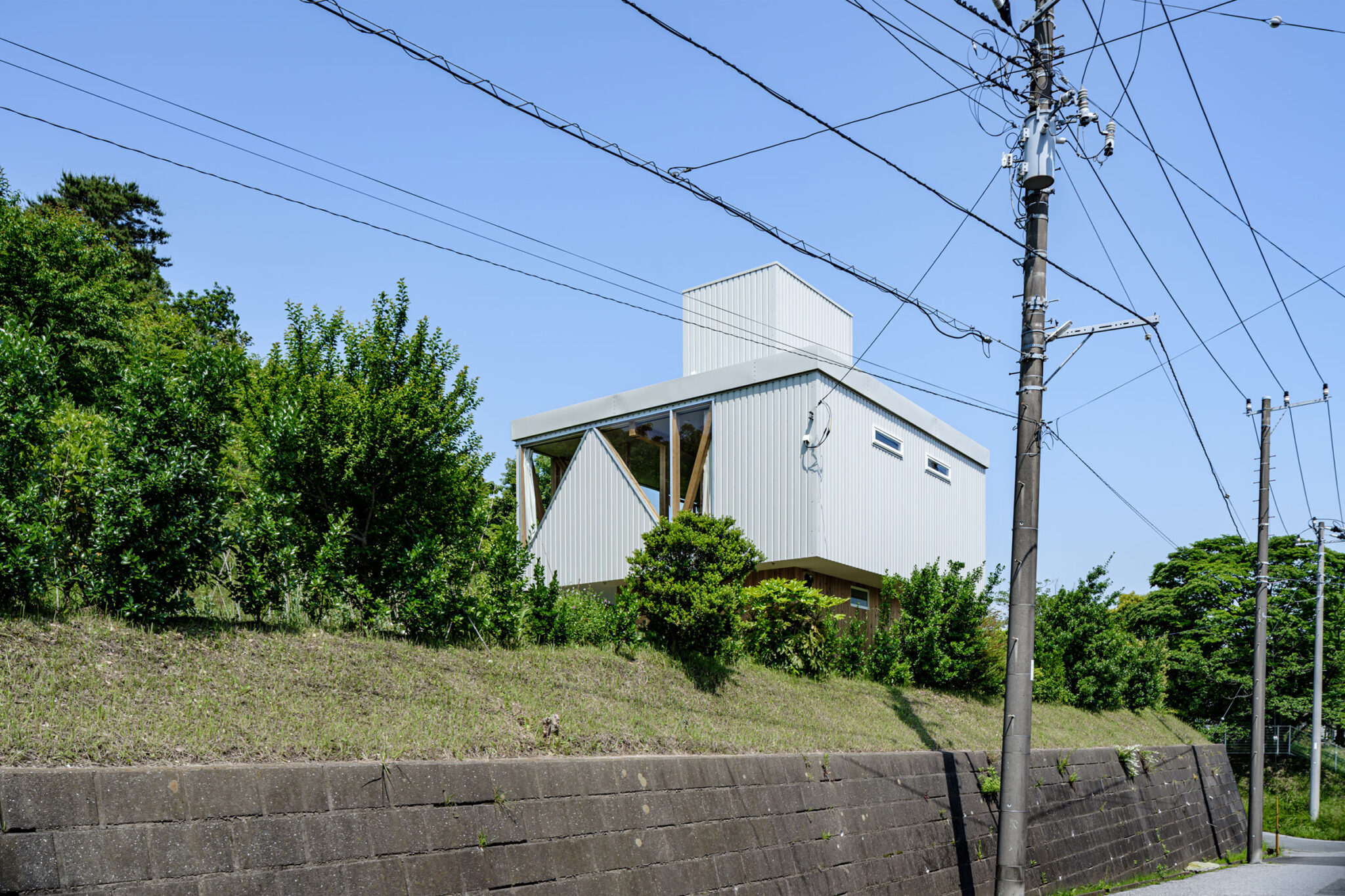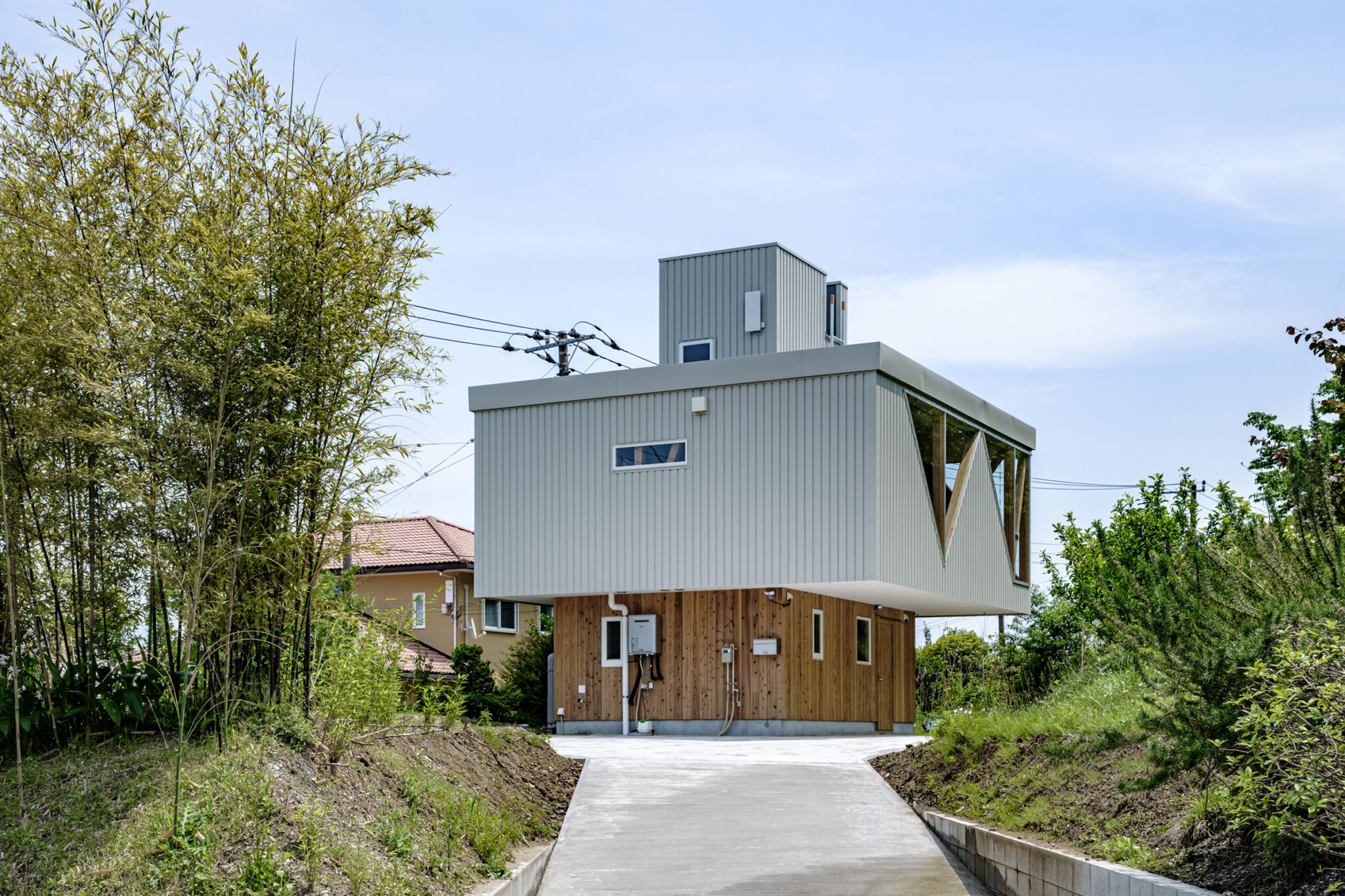 kurosawa kawara-tenによる、千葉・木更津市の「Gさんのための家」。施主が手入れを続けてきた敷地での計画。望む建築を共に探る対話のプロセスを試み、“のびやか”だか“草花を守る為に大きな建物は避ける”という思いを発見。1階面積を抑えて2階部分を大きく跳ね出す建築を考案屋根 photo©千葉正人