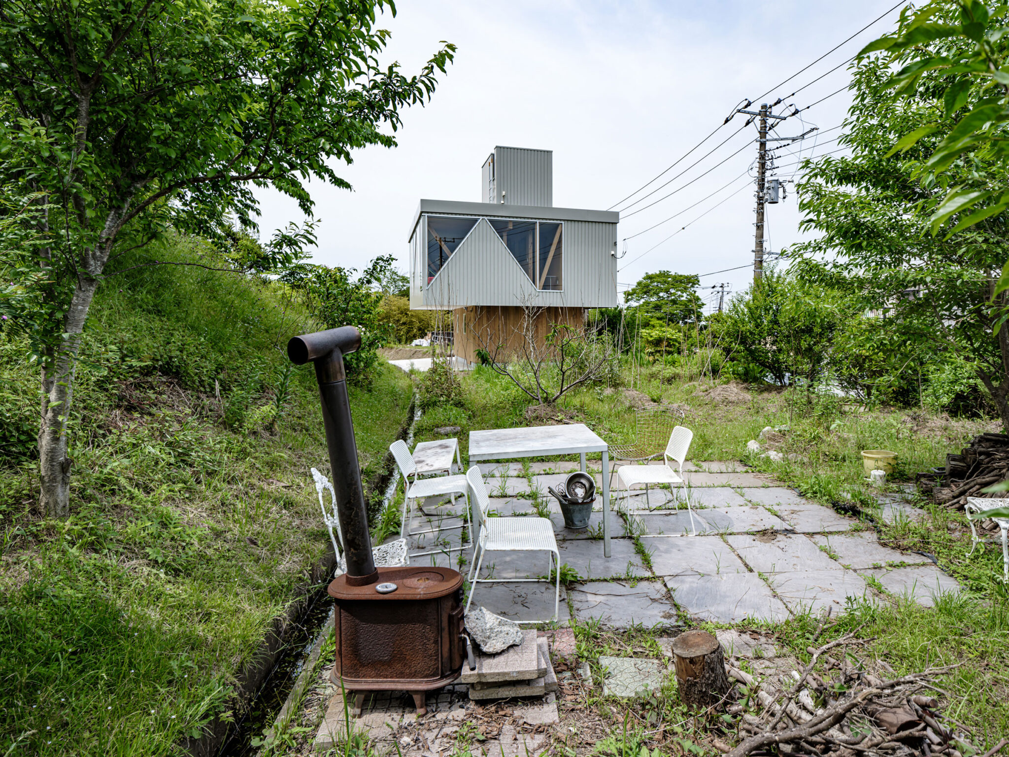 kurosawa kawara-tenによる、千葉・木更津市の「Gさんのための家」。施主が手入れを続けてきた敷地での計画。望む建築を共に探る対話のプロセスを試み、“のびやか”だか“草花を守る為に大きな建物は避ける”という思いを発見。1階面積を抑えて2階部分を大きく跳ね出す建築を考案俯瞰、北西側より見下ろす。 photo©千葉正人