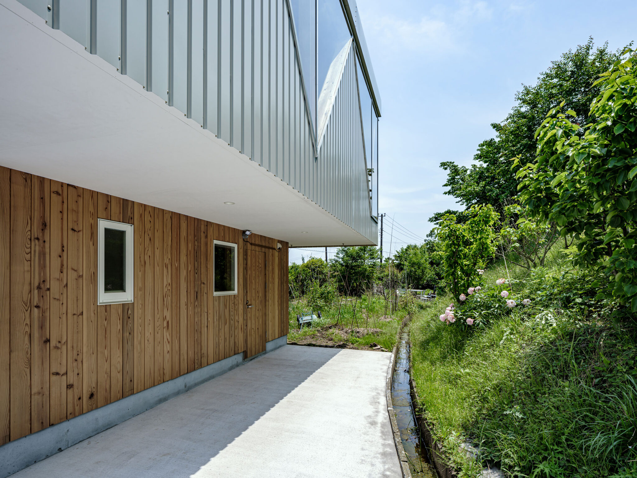 kurosawa kawara-tenによる、千葉・木更津市の「Gさんのための家」。施主が手入れを続けてきた敷地での計画。望む建築を共に探る対話のプロセスを試み、“のびやか”だか“草花を守る為に大きな建物は避ける”という思いを発見。1階面積を抑えて2階部分を大きく跳ね出す建築を考案外観、開口部の詳細 photo©千葉正人