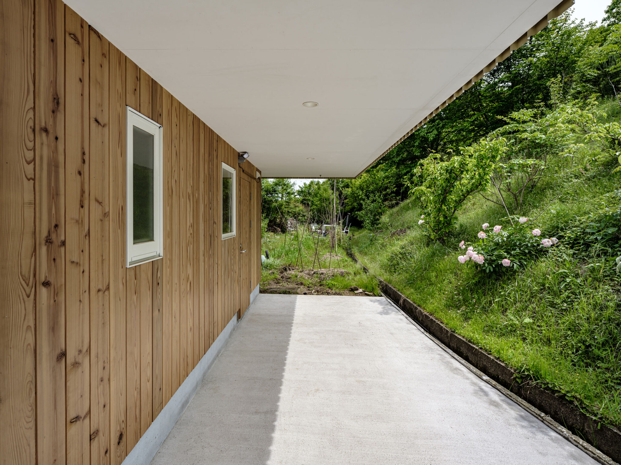kurosawa kawara-tenによる、千葉・木更津市の「Gさんのための家」。施主が手入れを続けてきた敷地での計画。望む建築を共に探る対話のプロセスを試み、“のびやか”だか“草花を守る為に大きな建物は避ける”という思いを発見。1階面積を抑えて2階部分を大きく跳ね出す建築を考案軒下、玄関側を見る。 photo©千葉正人