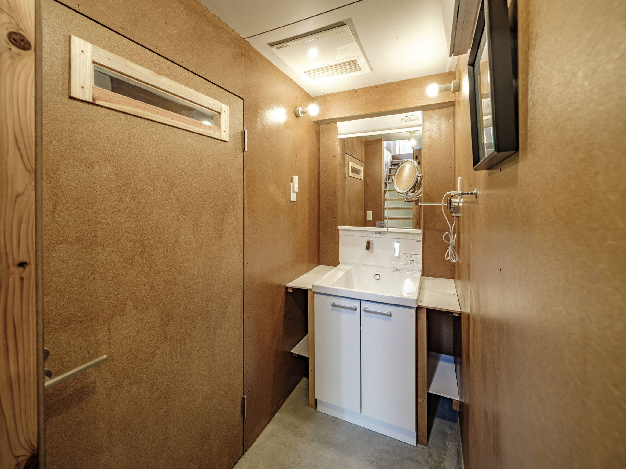 kurosawa kawara-tenによる、千葉・木更津市の「Gさんのための家」。施主が手入れを続けてきた敷地での計画。望む建築を共に探る対話のプロセスを試み、“のびやか”だか“草花を守る為に大きな建物は避ける”という思いを発見。1階面積を抑えて2階部分を大きく跳ね出す建築を考案1階、洗面 photo©千葉正人