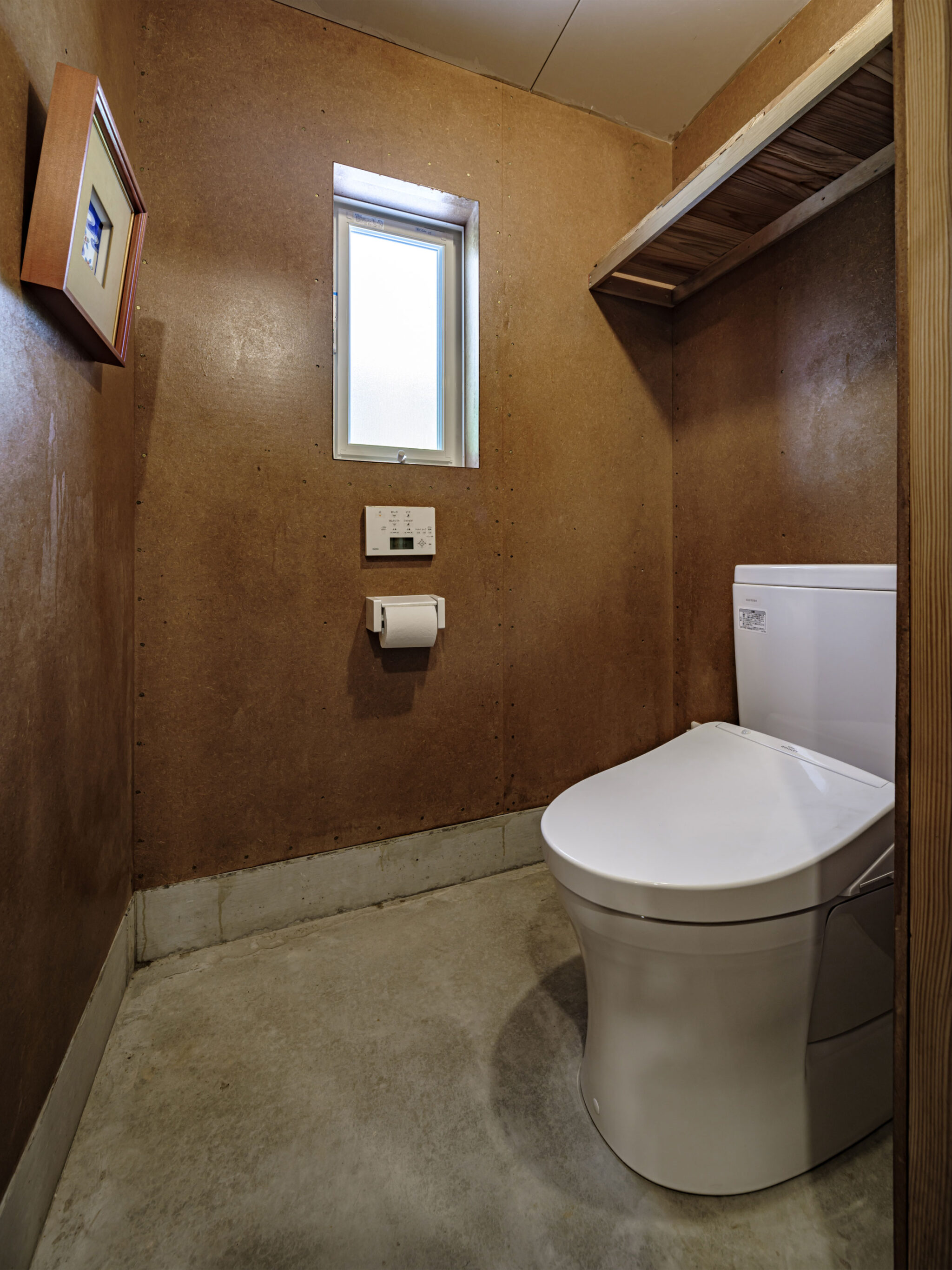 kurosawa kawara-tenによる、千葉・木更津市の「Gさんのための家」。施主が手入れを続けてきた敷地での計画。望む建築を共に探る対話のプロセスを試み、“のびやか”だか“草花を守る為に大きな建物は避ける”という思いを発見。1階面積を抑えて2階部分を大きく跳ね出す建築を考案1階、トイレ photo©千葉正人