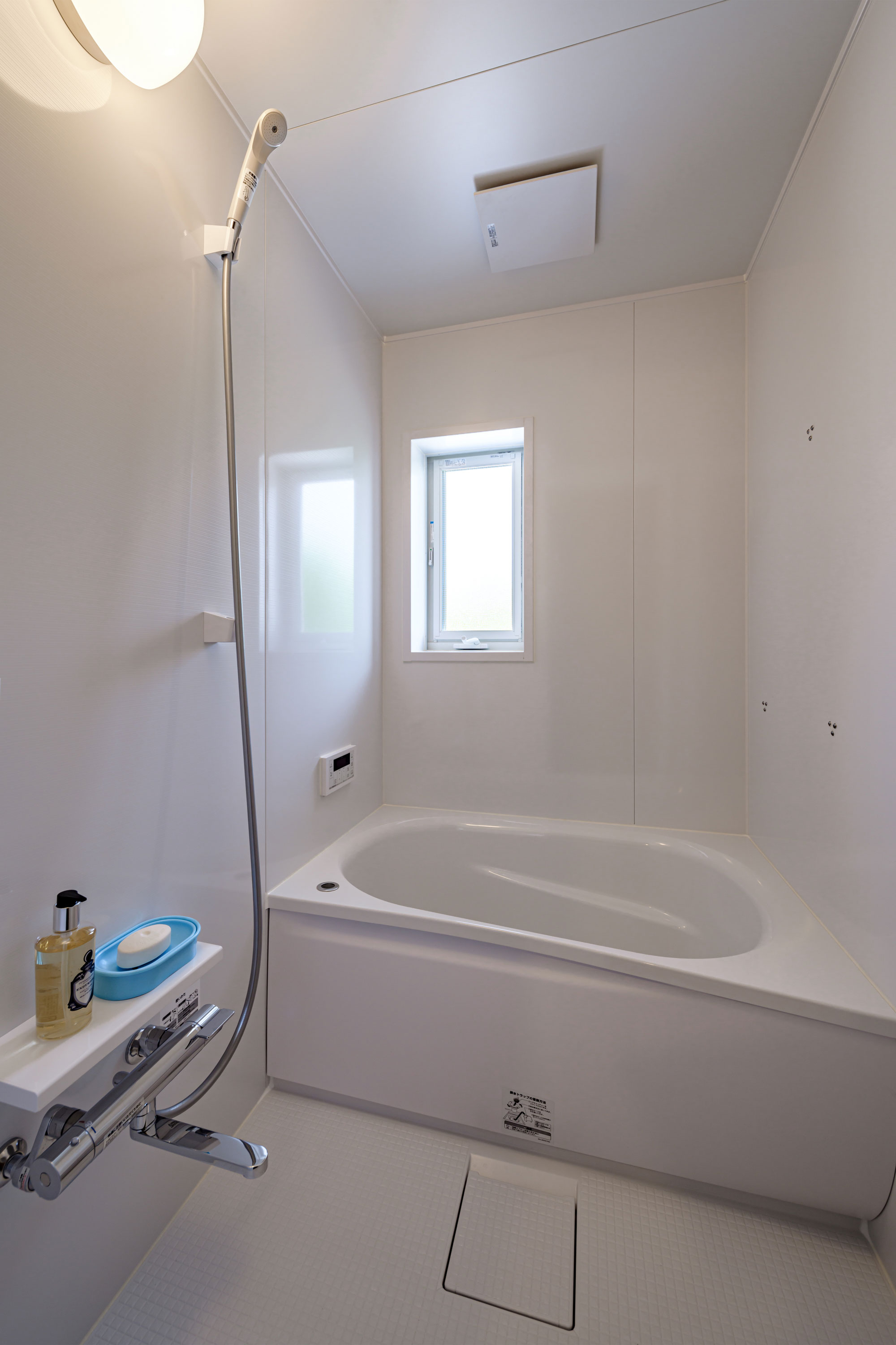 kurosawa kawara-tenによる、千葉・木更津市の「Gさんのための家」。施主が手入れを続けてきた敷地での計画。望む建築を共に探る対話のプロセスを試み、“のびやか”だか“草花を守る為に大きな建物は避ける”という思いを発見。1階面積を抑えて2階部分を大きく跳ね出す建築を考案1階、浴室 photo©千葉正人