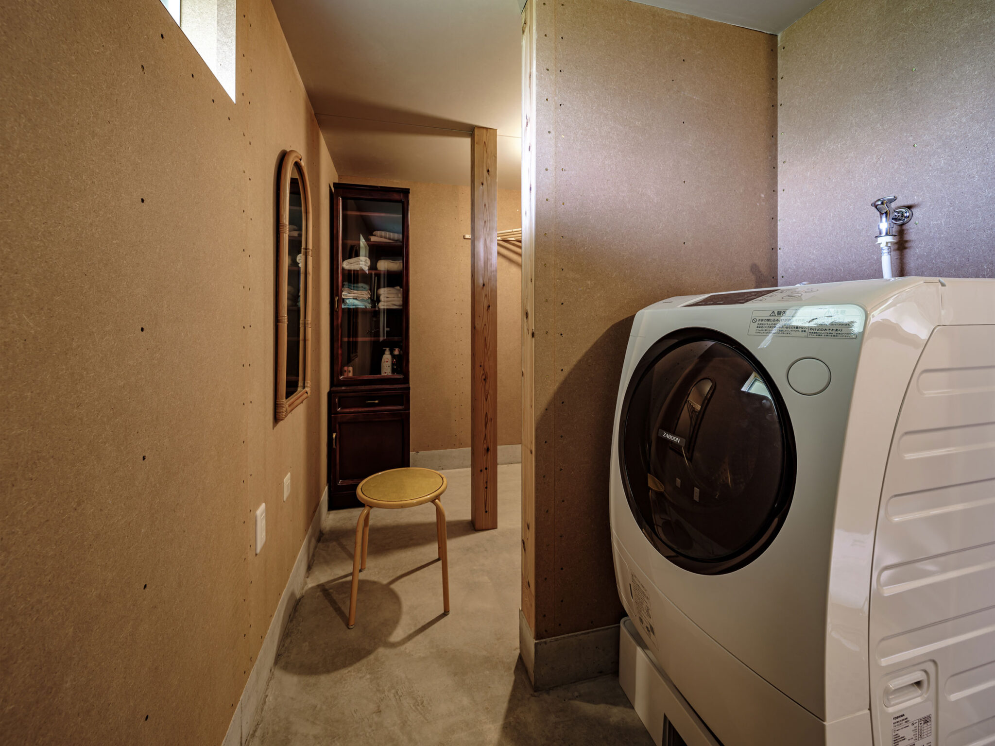 kurosawa kawara-tenによる、千葉・木更津市の「Gさんのための家」。施主が手入れを続けてきた敷地での計画。望む建築を共に探る対話のプロセスを試み、“のびやか”だか“草花を守る為に大きな建物は避ける”という思いを発見。1階面積を抑えて2階部分を大きく跳ね出す建築を考案1階、洗濯室 photo©千葉正人