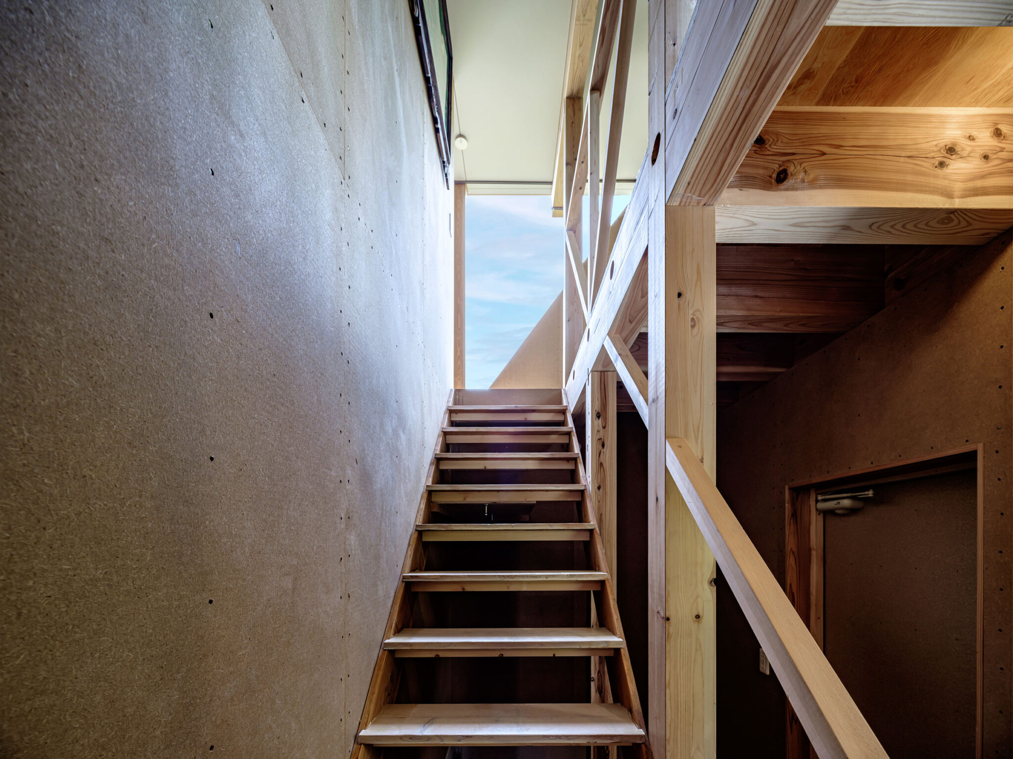 kurosawa kawara-tenによる、千葉・木更津市の「Gさんのための家」。施主が手入れを続けてきた敷地での計画。望む建築を共に探る対話のプロセスを試み、“のびやか”だか“草花を守る為に大きな建物は避ける”という思いを発見。1階面積を抑えて2階部分を大きく跳ね出す建築を考案1階から2階への階段 photo©千葉正人