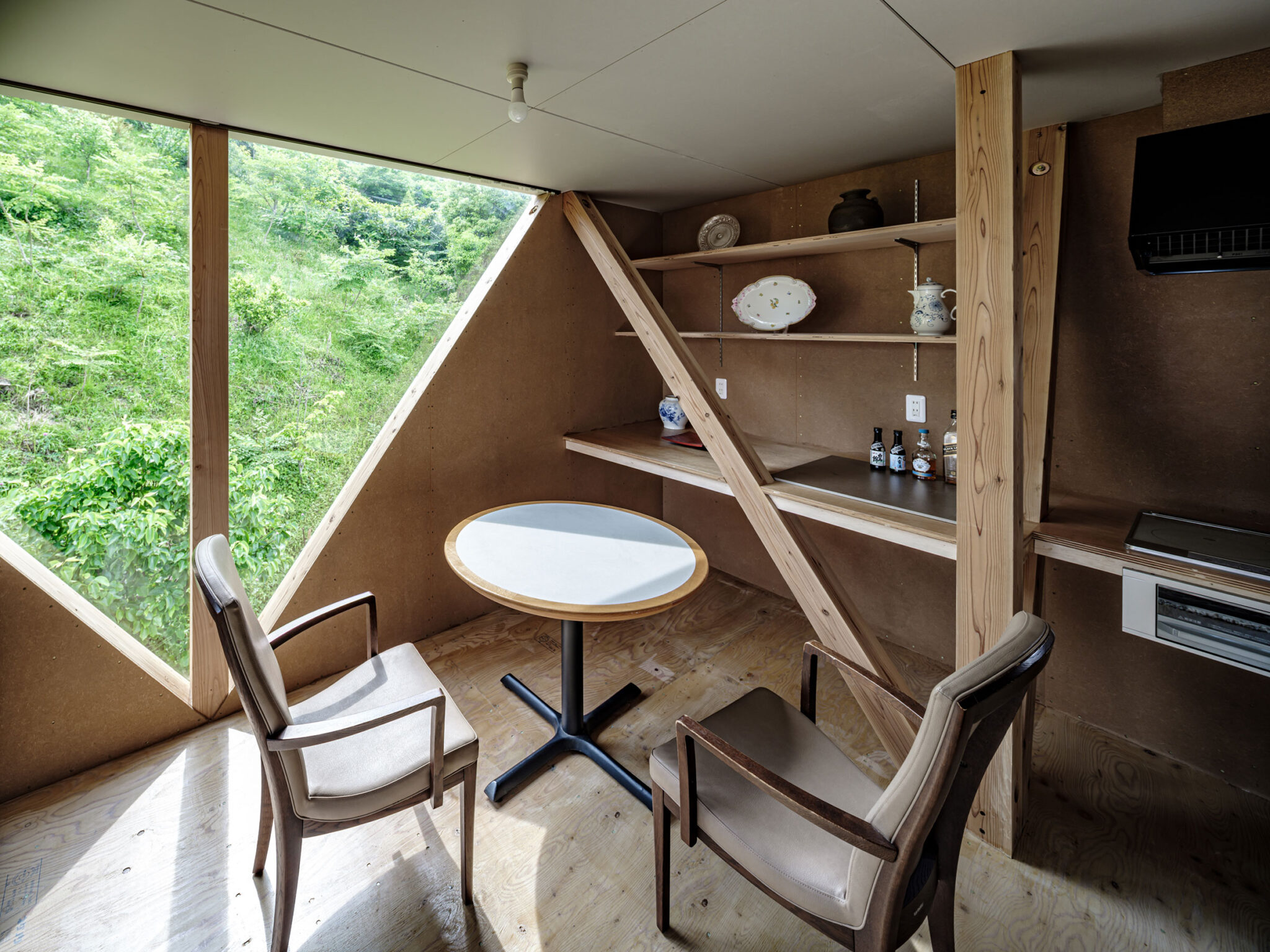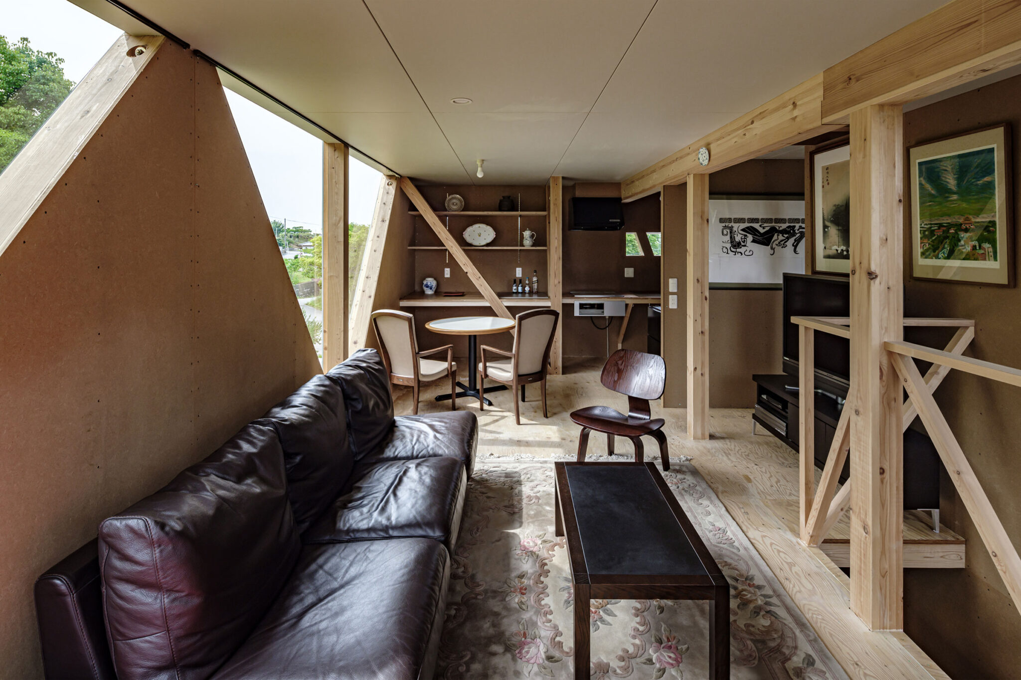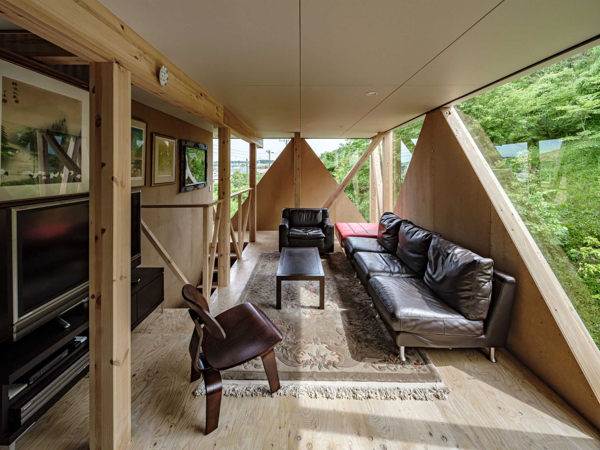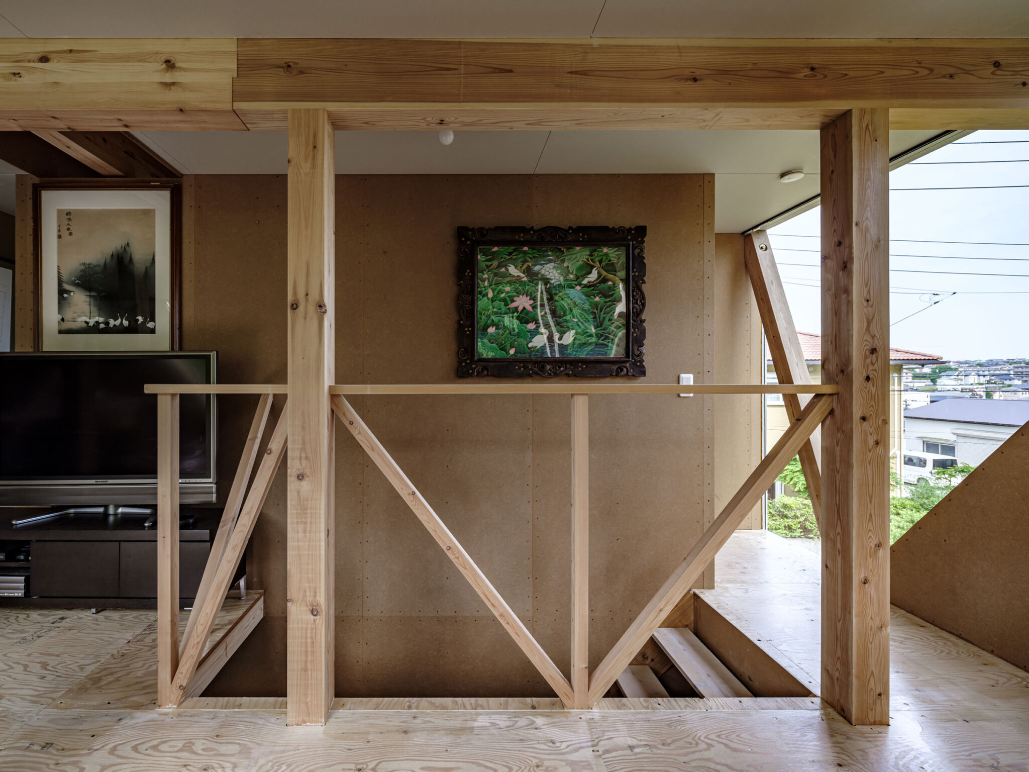 2階が全周を大きく跳ね出した形式であるため、眺望が欲しい山側にはトラスを組んで大きな開口と剛性を確保し、その他の面には倍率の高い構造面材を張って強度を担保しています。