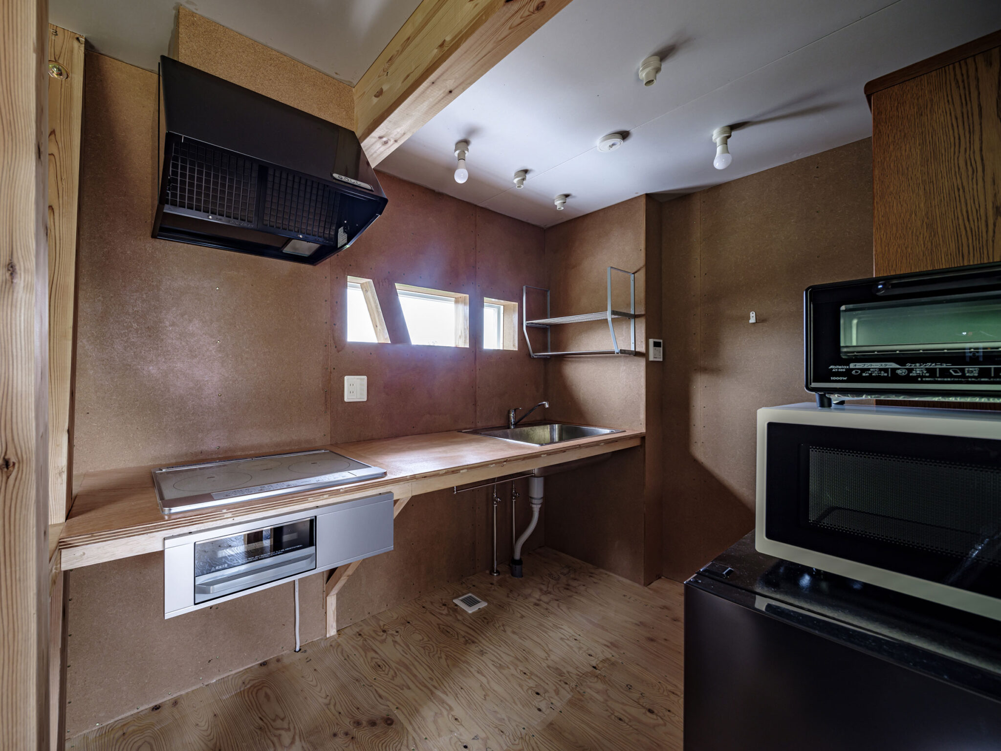 結果として、跳ね出し部分を支えるため、室内にも斜材が現れていますが、キッチンの棚やハンモックコーナーとして積極的に活用されています。