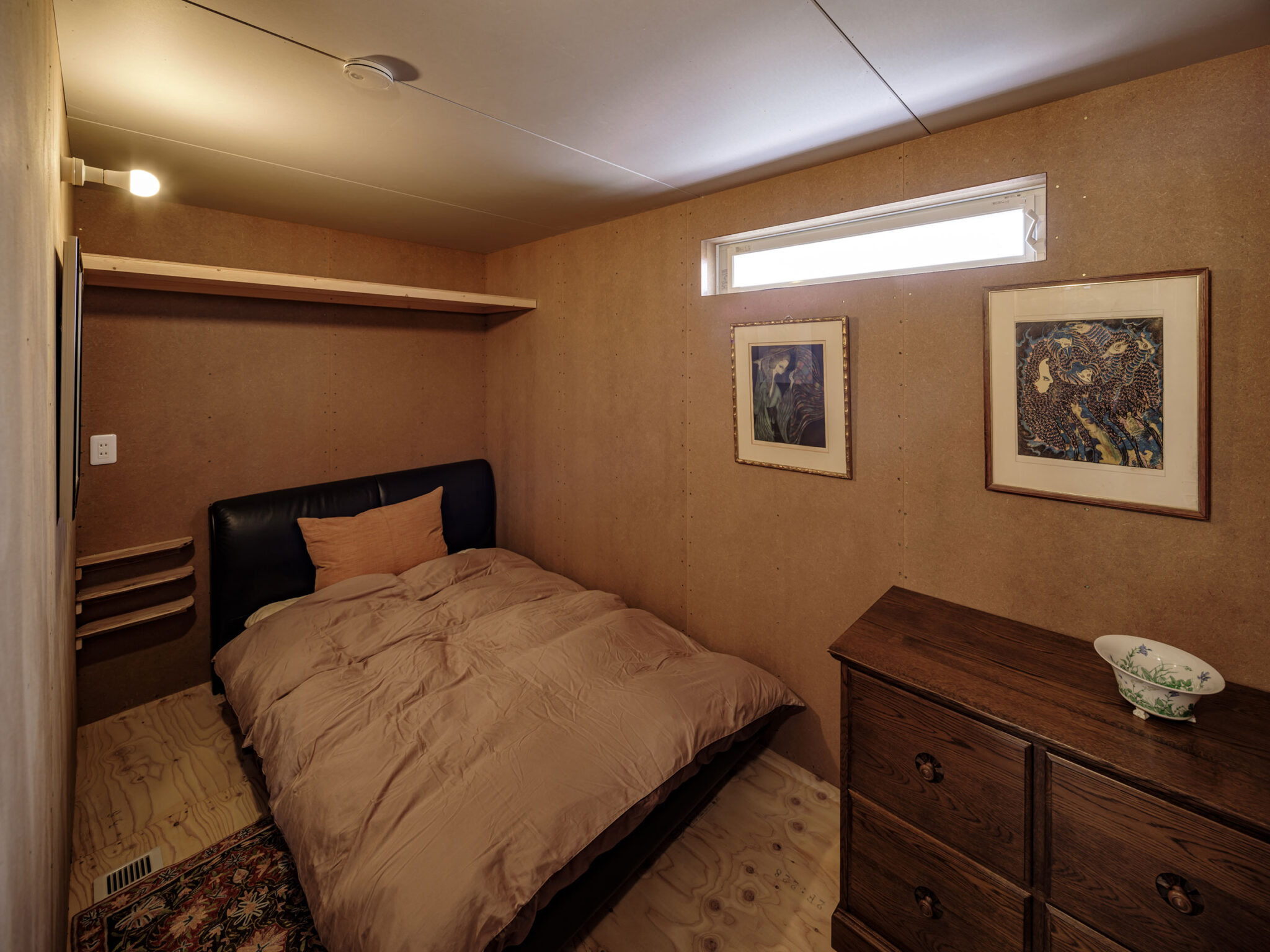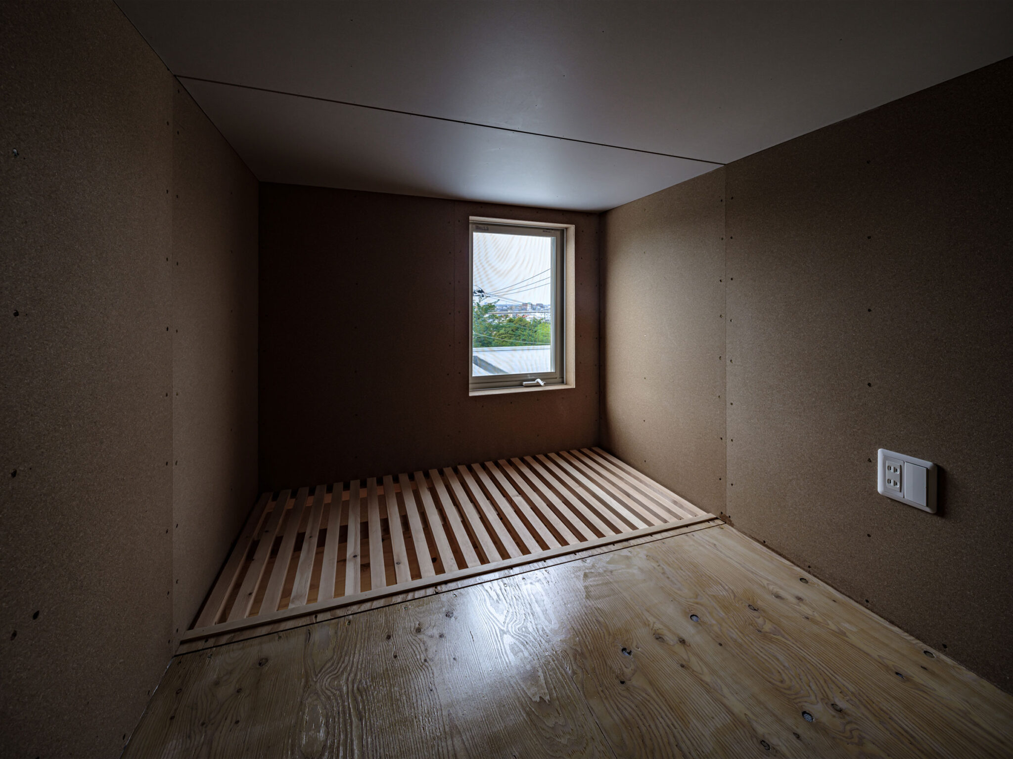 kurosawa kawara-tenによる、千葉・木更津市の「Gさんのための家」。施主が手入れを続けてきた敷地での計画。望む建築を共に探る対話のプロセスを試み、“のびやか”だか“草花を守る為に大きな建物は避ける”という思いを発見。1階面積を抑えて2階部分を大きく跳ね出す建築を考案2階、寝室2 photo©千葉正人