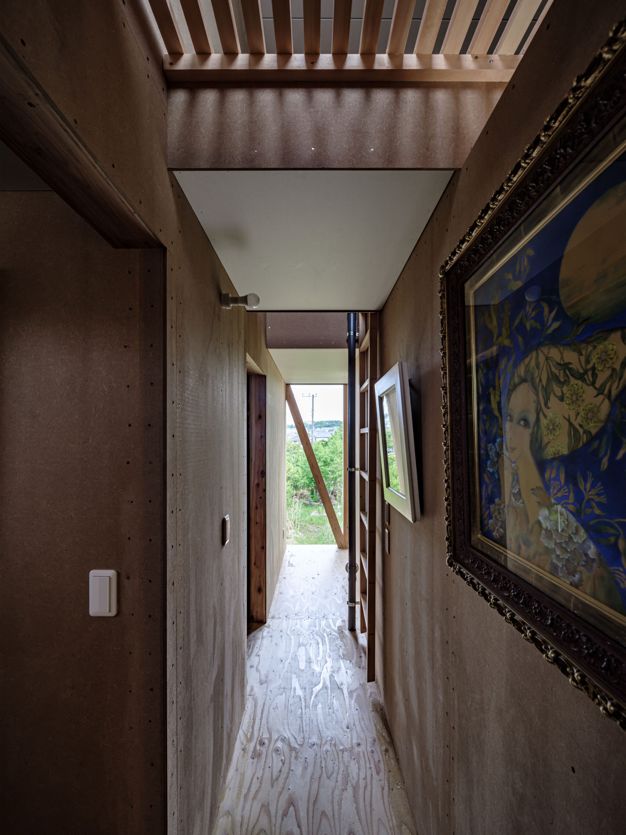 kurosawa kawara-tenによる、千葉・木更津市の「Gさんのための家」。施主が手入れを続けてきた敷地での計画。望む建築を共に探る対話のプロセスを試み、“のびやか”だか“草花を守る為に大きな建物は避ける”という思いを発見。1階面積を抑えて2階部分を大きく跳ね出す建築を考案2階、廊下 photo©千葉正人