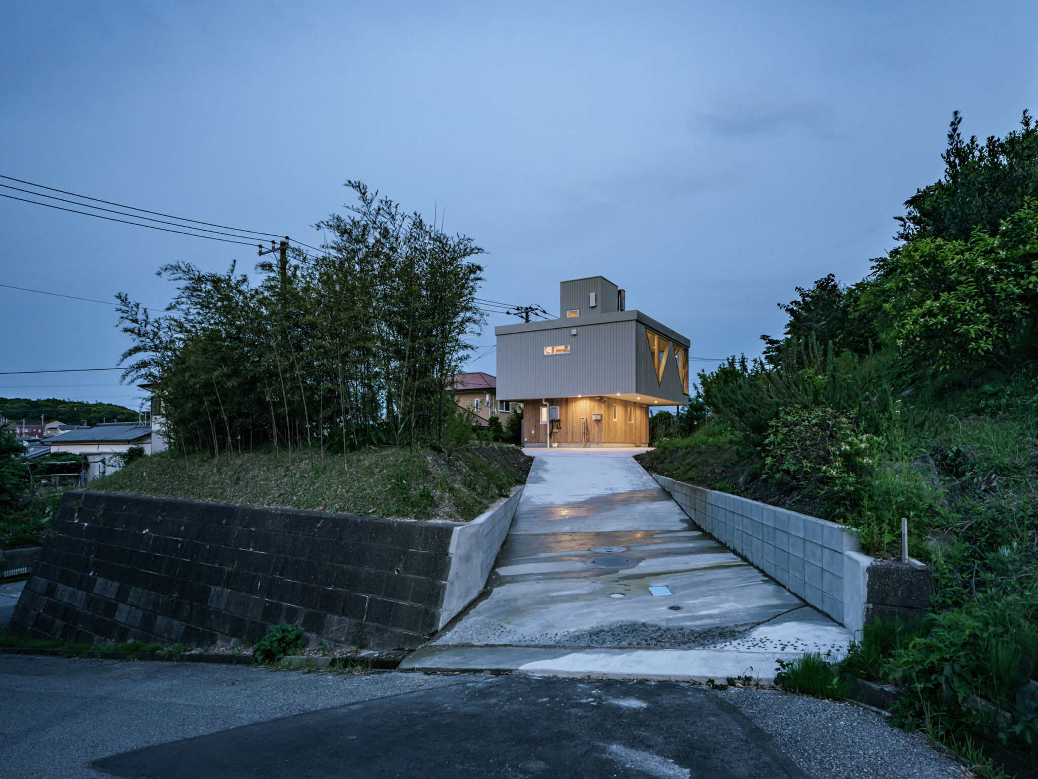 kurosawa kawara-tenによる、千葉・木更津市の「Gさんのための家」。施主が手入れを続けてきた敷地での計画。望む建築を共に探る対話のプロセスを試み、“のびやか”だか“草花を守る為に大きな建物は避ける”という思いを発見。1階面積を抑えて2階部分を大きく跳ね出す建築を考案外観、北側の道路より見る。夕景 photo©千葉正人