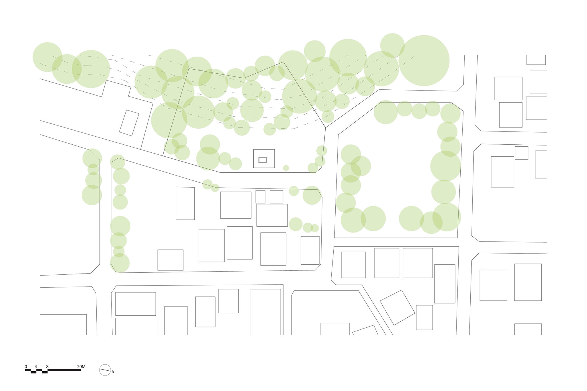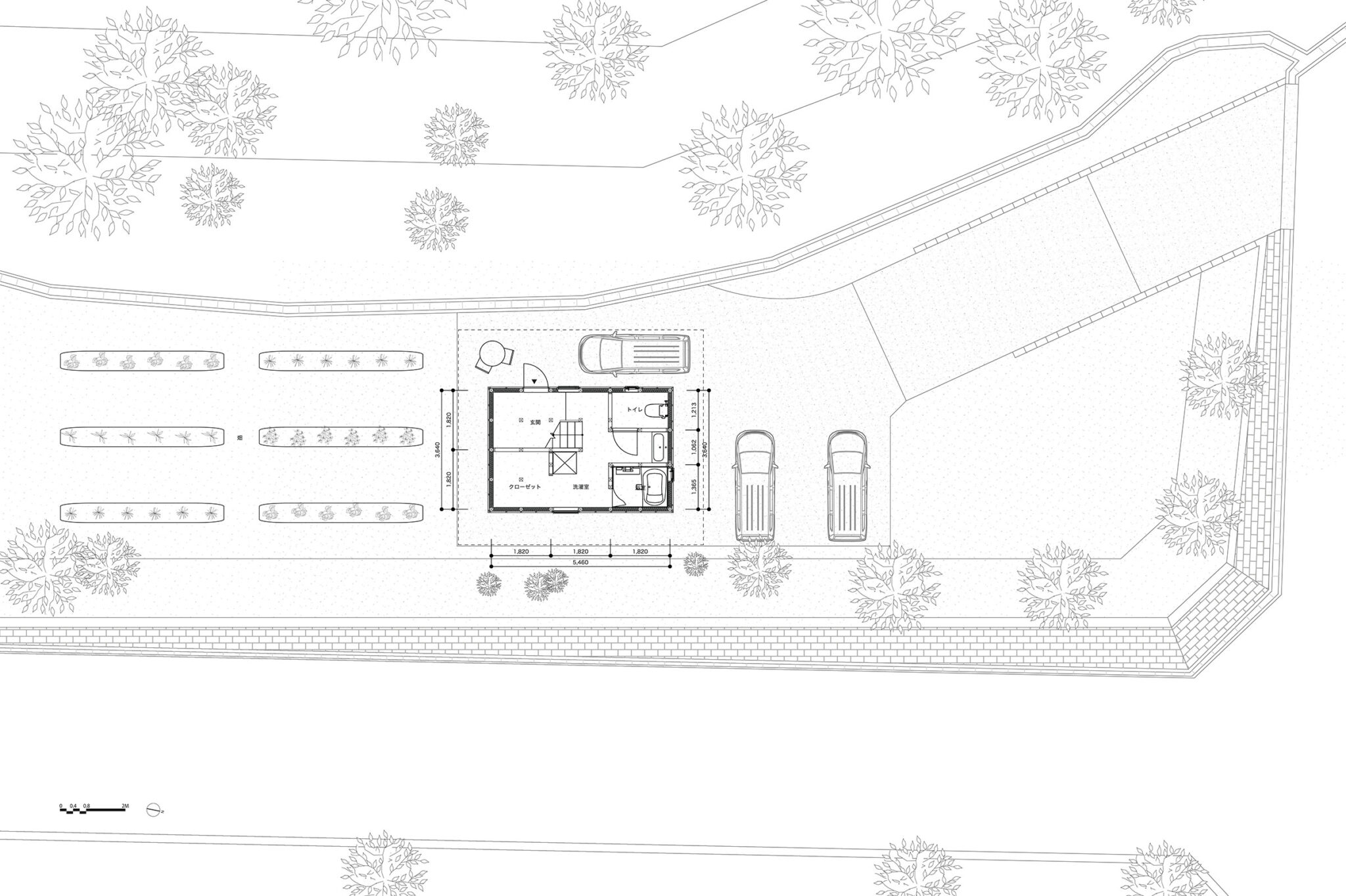 kurosawa kawara-tenによる、千葉・木更津市の「Gさんのための家」。施主が手入れを続けてきた敷地での計画。望む建築を共に探る対話のプロセスを試み、“のびやか”だか“草花を守る為に大きな建物は避ける”という思いを発見。1階面積を抑えて2階部分を大きく跳ね出す建築を考案広域配置図 image©kurosawa kawara-ten