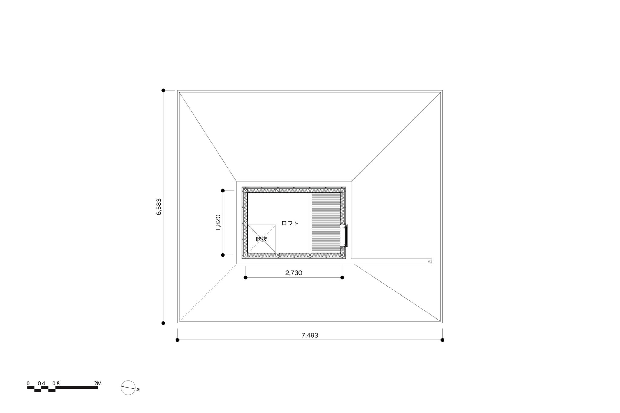 kurosawa kawara-tenによる、千葉・木更津市の「Gさんのための家」。施主が手入れを続けてきた敷地での計画。望む建築を共に探る対話のプロセスを試み、“のびやか”だか“草花を守る為に大きな建物は避ける”という思いを発見。1階面積を抑えて2階部分を大きく跳ね出す建築を考案ロフト階平面図 image©kurosawa kawara-ten