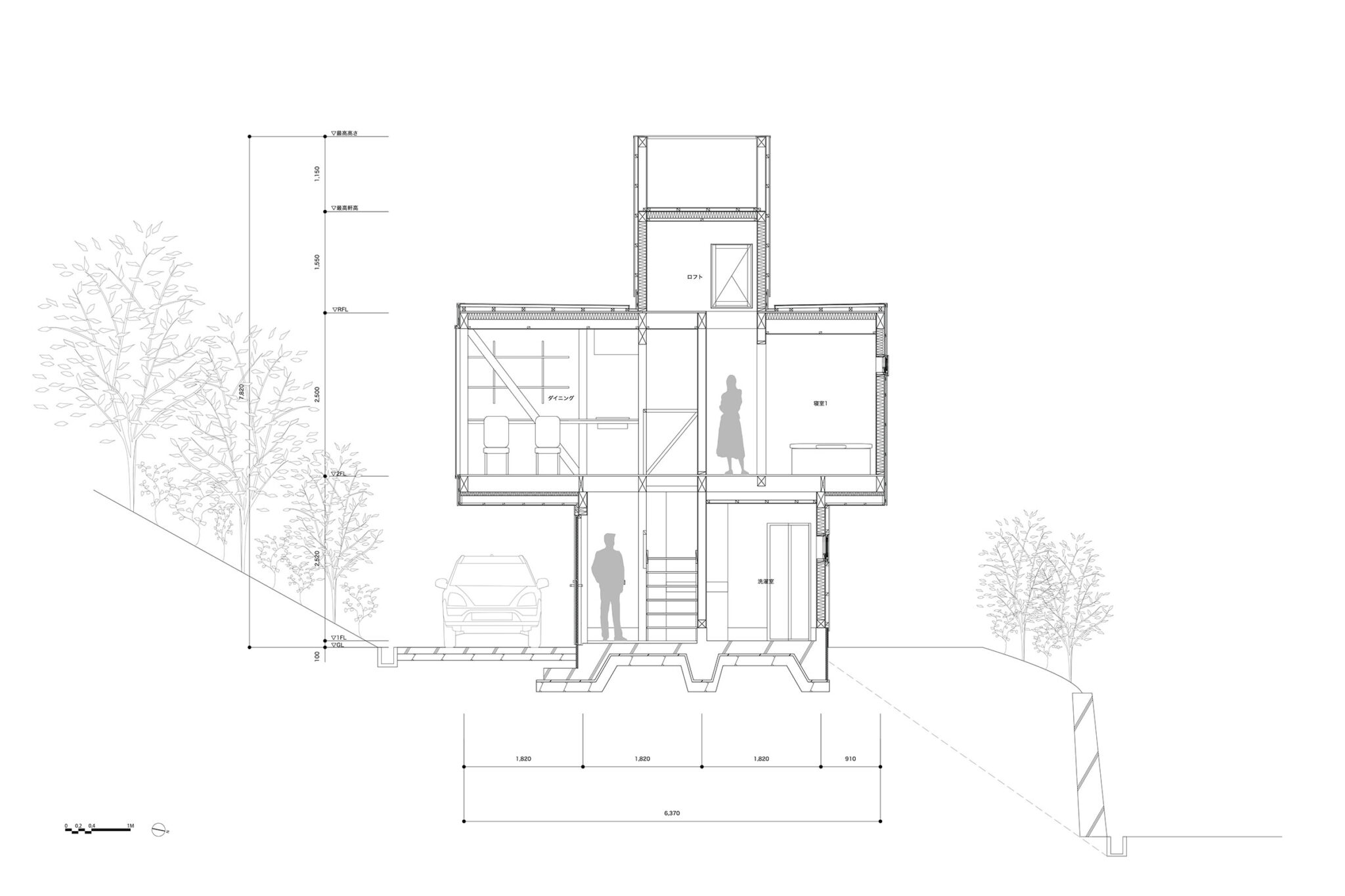 kurosawa kawara-tenによる、千葉・木更津市の「Gさんのための家」。施主が手入れを続けてきた敷地での計画。望む建築を共に探る対話のプロセスを試み、“のびやか”だか“草花を守る為に大きな建物は避ける”という思いを発見。1階面積を抑えて2階部分を大きく跳ね出す建築を考案断面図 image©kurosawa kawara-ten
