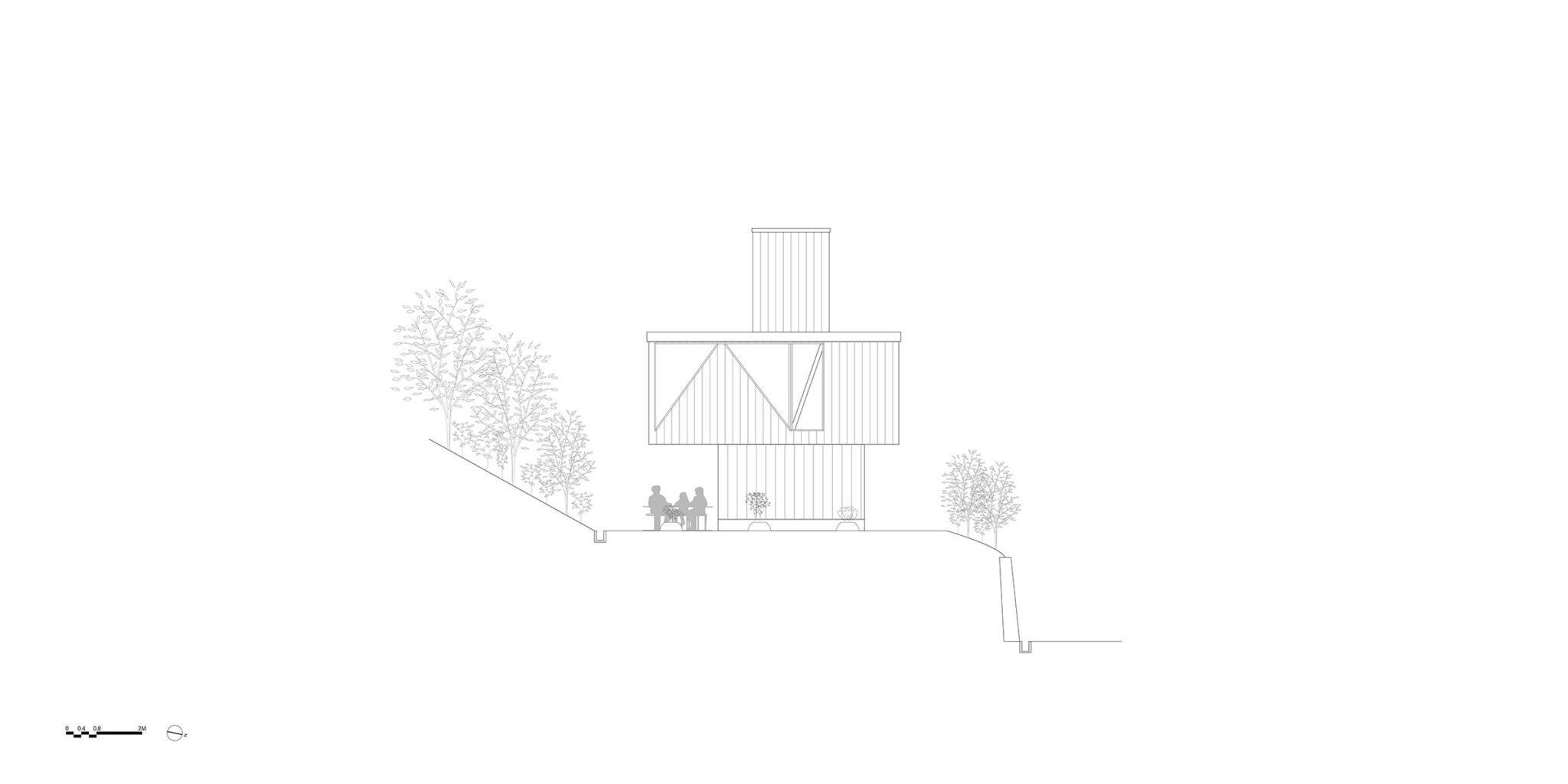 kurosawa kawara-tenによる、千葉・木更津市の「Gさんのための家」。施主が手入れを続けてきた敷地での計画。望む建築を共に探る対話のプロセスを試み、“のびやか”だか“草花を守る為に大きな建物は避ける”という思いを発見。1階面積を抑えて2階部分を大きく跳ね出す建築を考案南側立面図 image©kurosawa kawara-ten