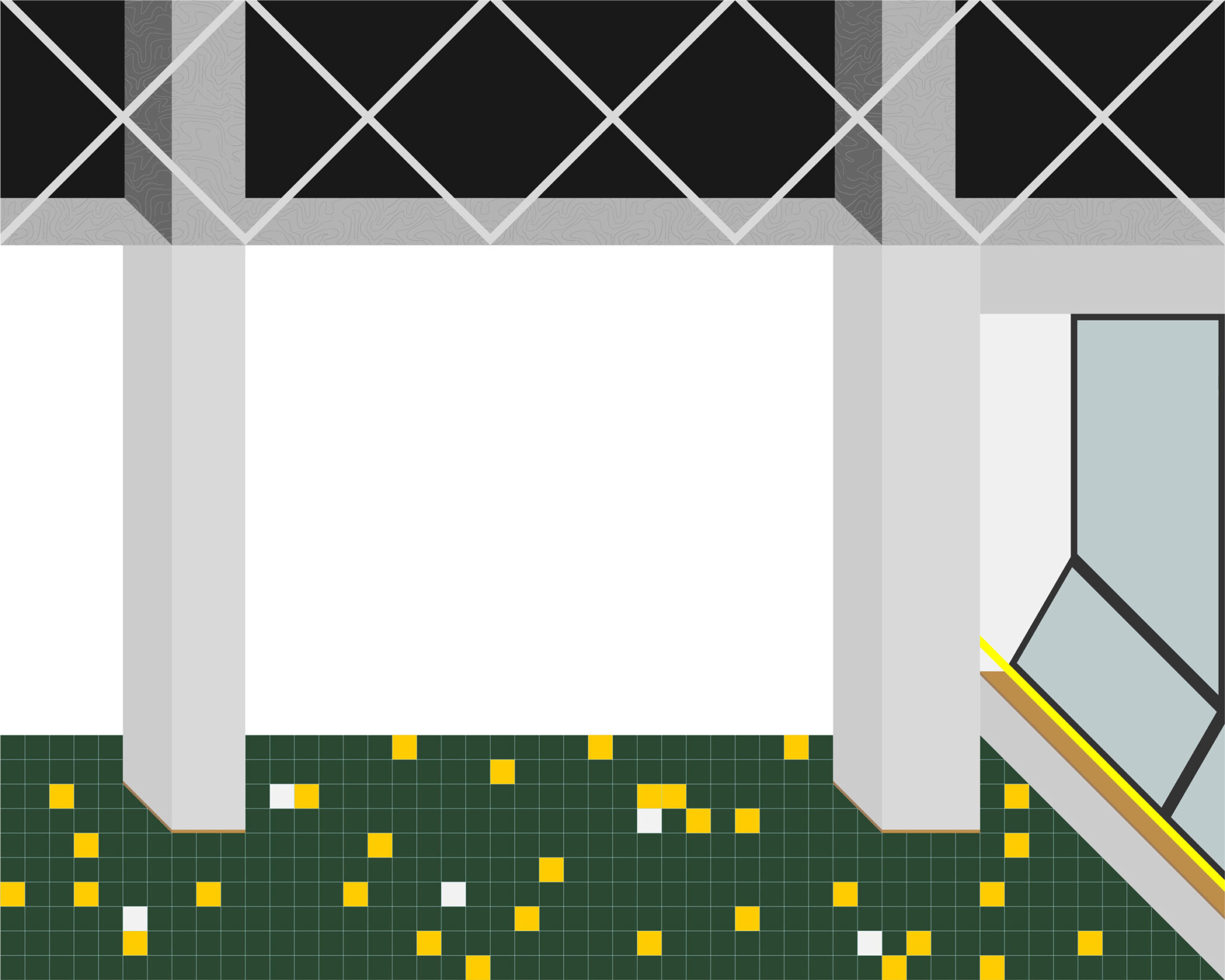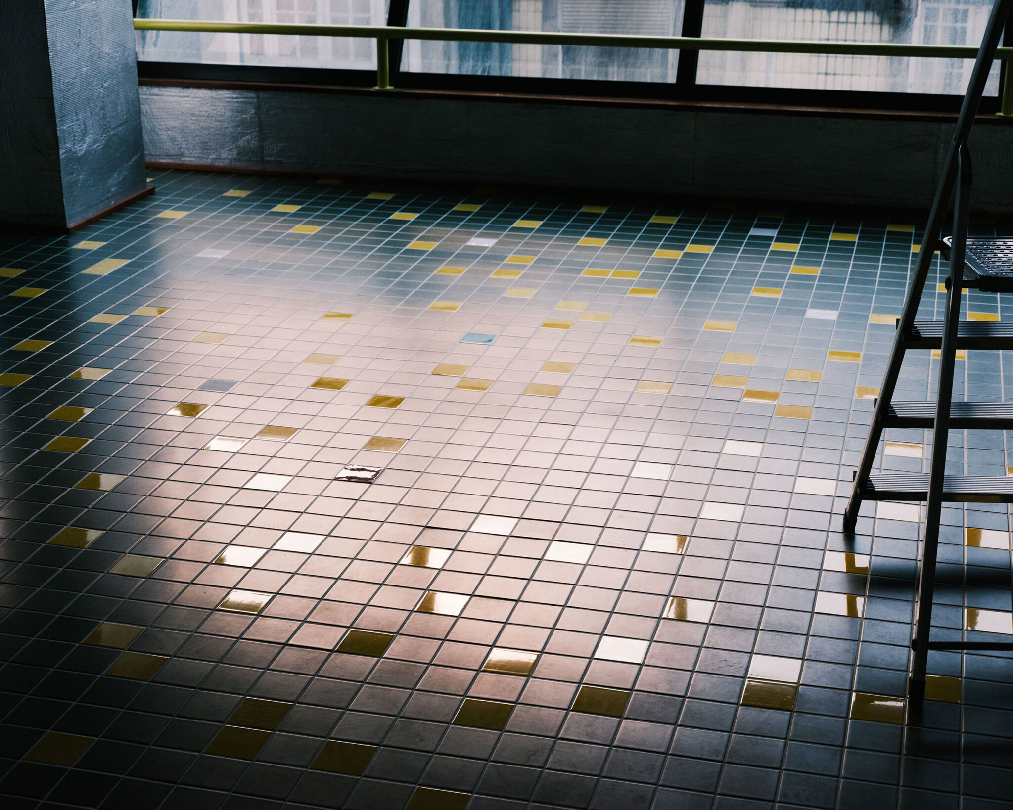 The floor establishes the first gesture. Green tiles spread across the surface, punctuated by scattered yellow squares that resemble flowers fallen from an absent garden. The pattern is systematic yet strangely casual—an abstract meadow translated into ceramic. It introduces an unexpected optimism. Flowers appear where neutrality would normally prevail, transforming the office into a small cultivated landscape.