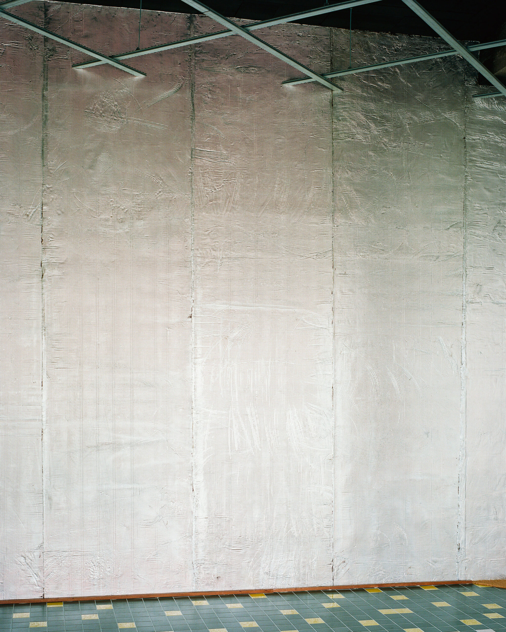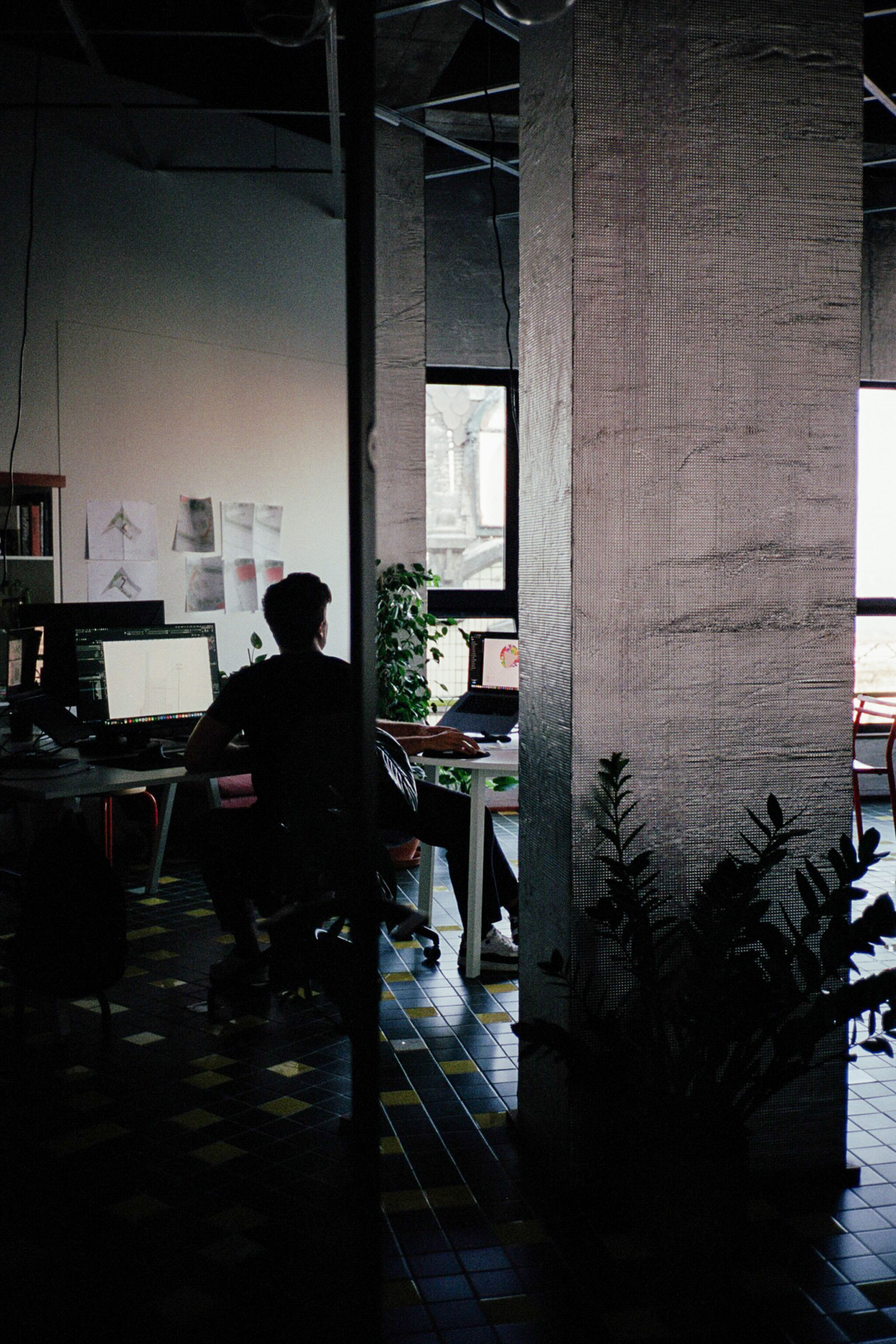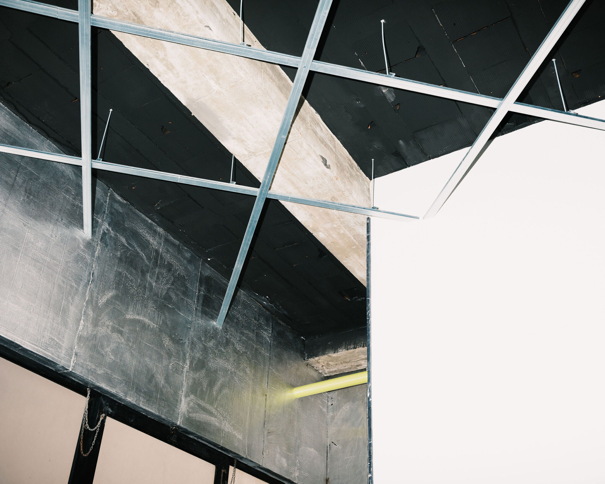 Between these two layers—the tiled meadow below and the metallic constellation above—the office unfolds with minimal interruption. Strong columns and opaque walls keep their presence, occasionally wrapped in reflective asphaltic screen that multiply fragments of the room. Light enters through the deep formal window and moves across tiles, plants, and desks. The architecture avoids completion; it simply establishes a framework in which everyday work unfolds.