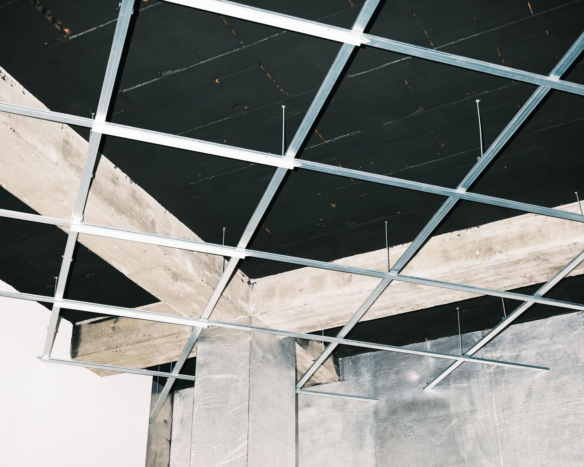 Above, the ceiling responds with an opposite move. Thin metal lines cross the space diagonally, forming a loose geometric web. They draw in the air what the tiles suggest on the ground: a second, lighter structure that floats overhead. The lines do not conceal the ceiling’s roughness; instead they acknowledge it. The project assembles inexpensive elements with a certain joy—a quiet, cheerful arte povera.