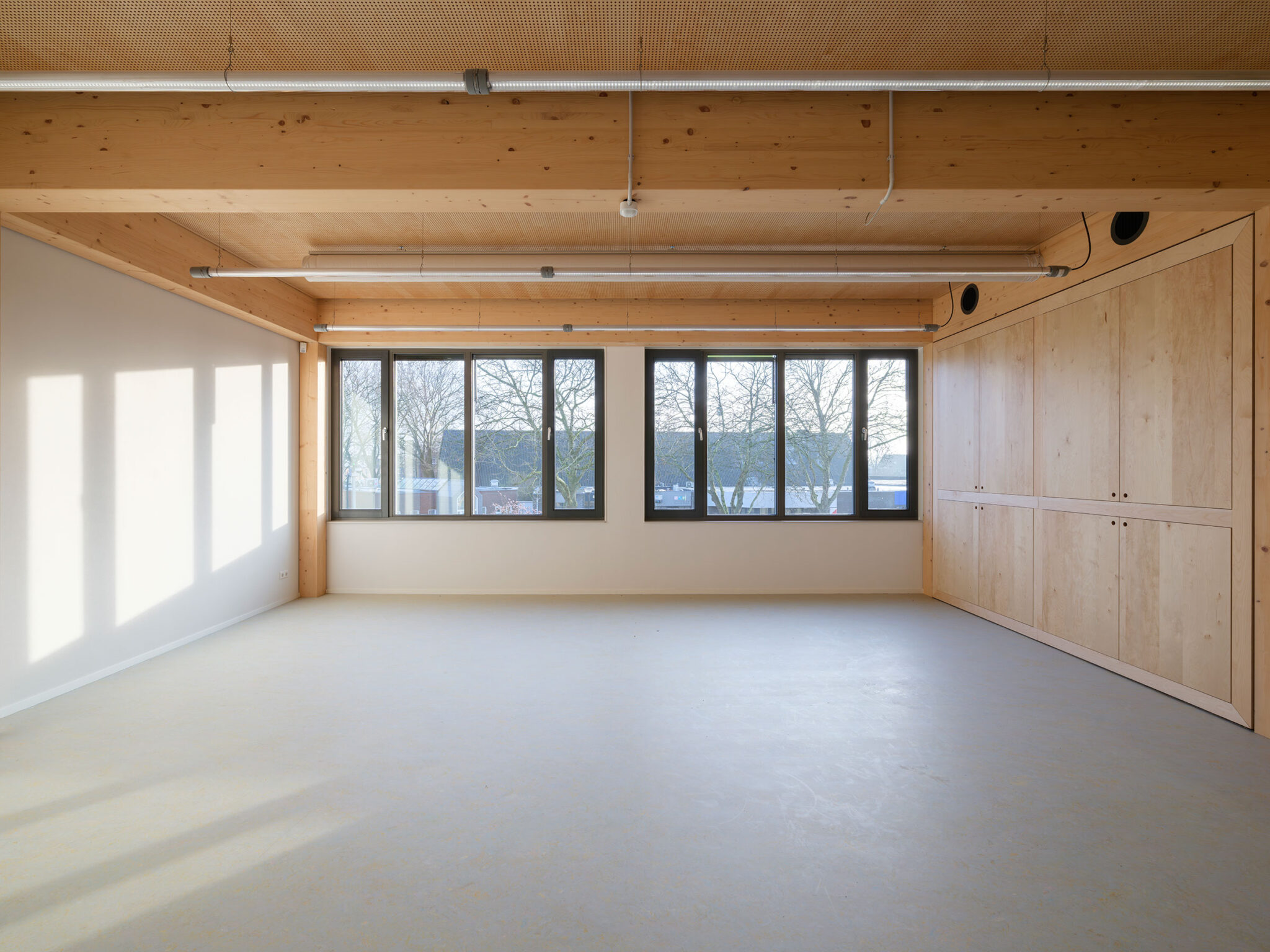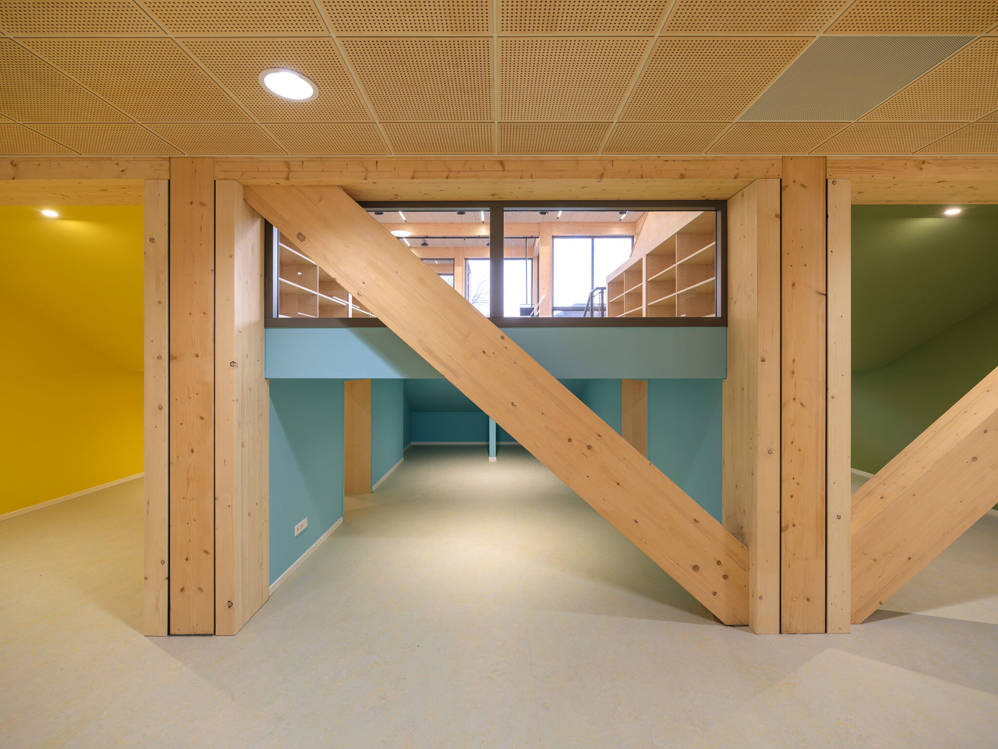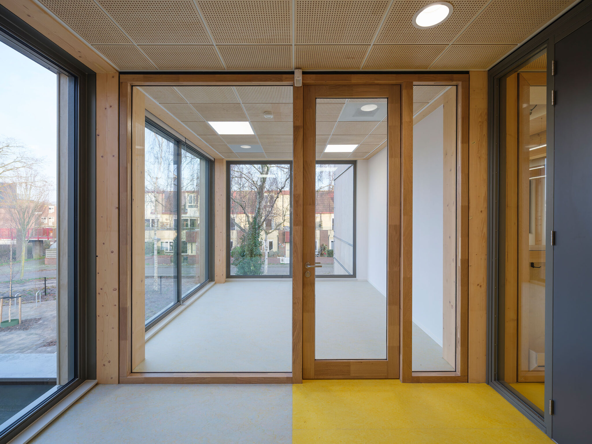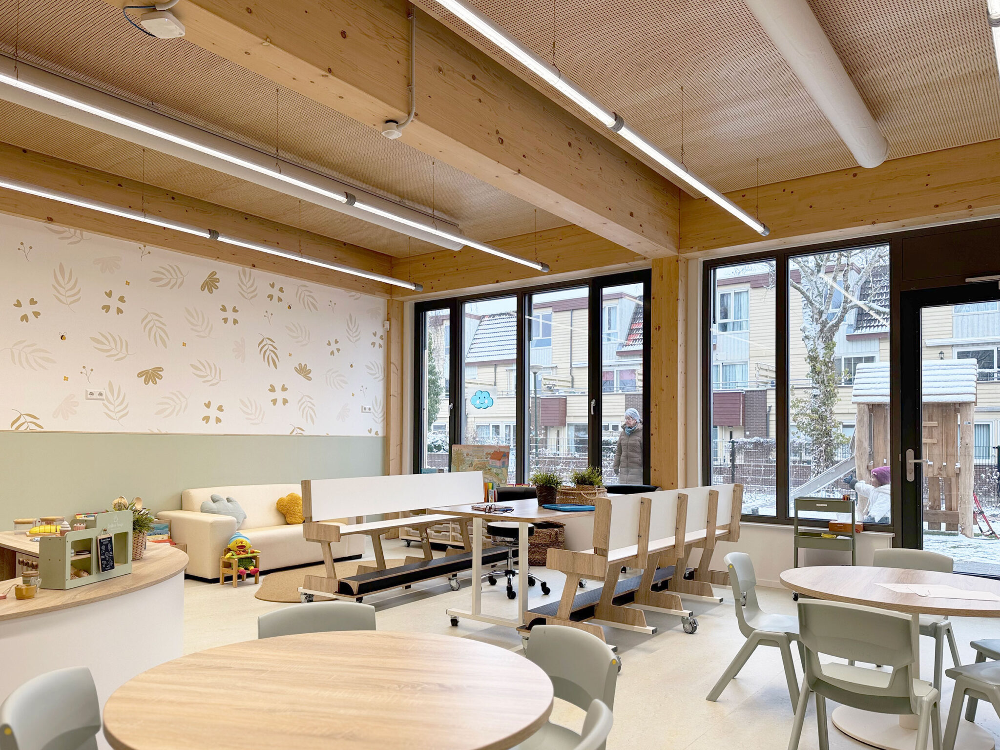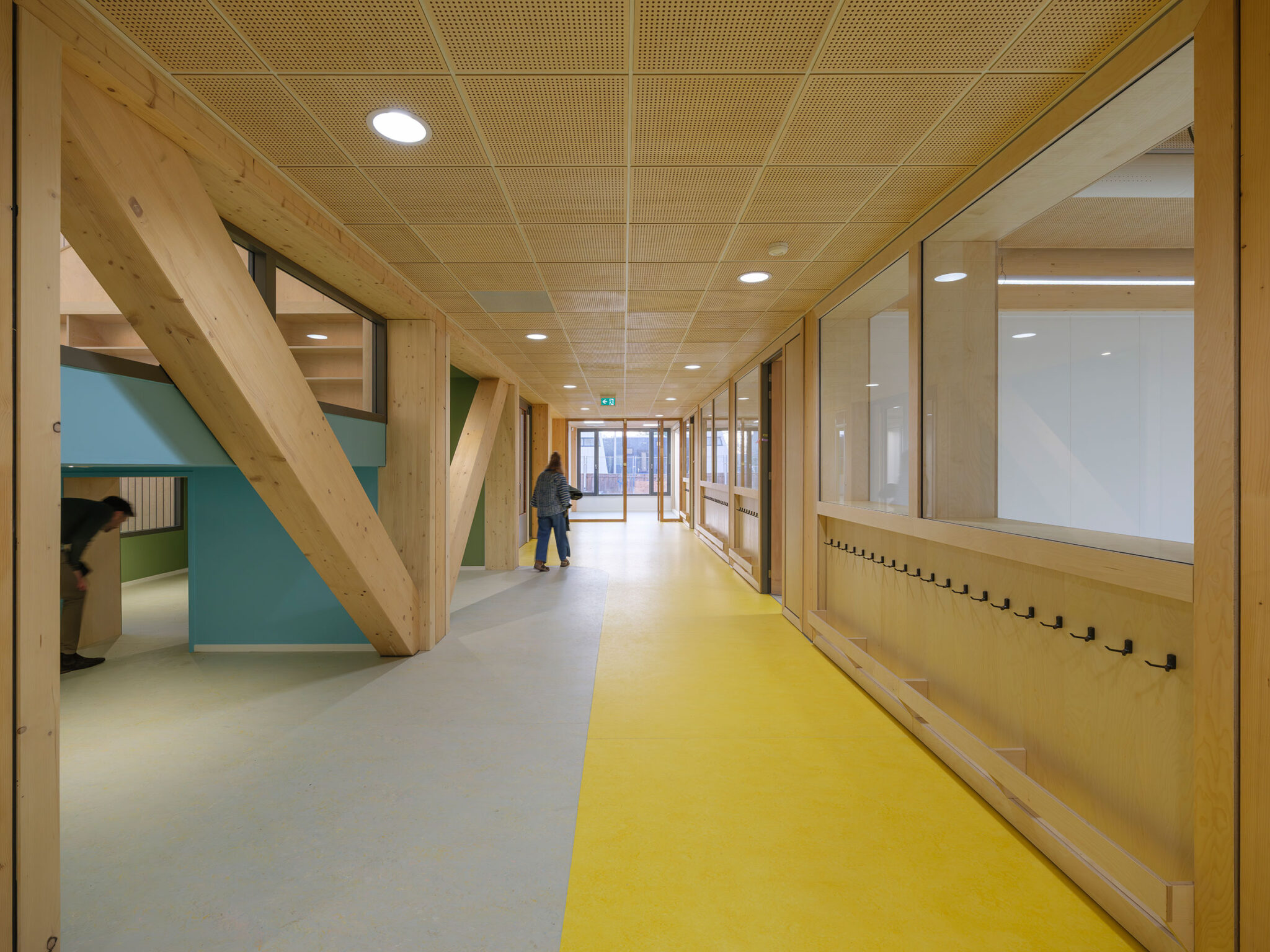 The wooden structural system accommodates finishes in various materials and colors. The facade is defined by large windows and French doors that connect children directly to the outside playgrounds. Inside, the bio-based partition walls can be adapted for different uses: some are cabinet walls containing lockers, coat racks and storage, while others function as exhibition walls showcasing pupils’ work and reinforcing the school’s identity. Building services are integrated above the ceiling.