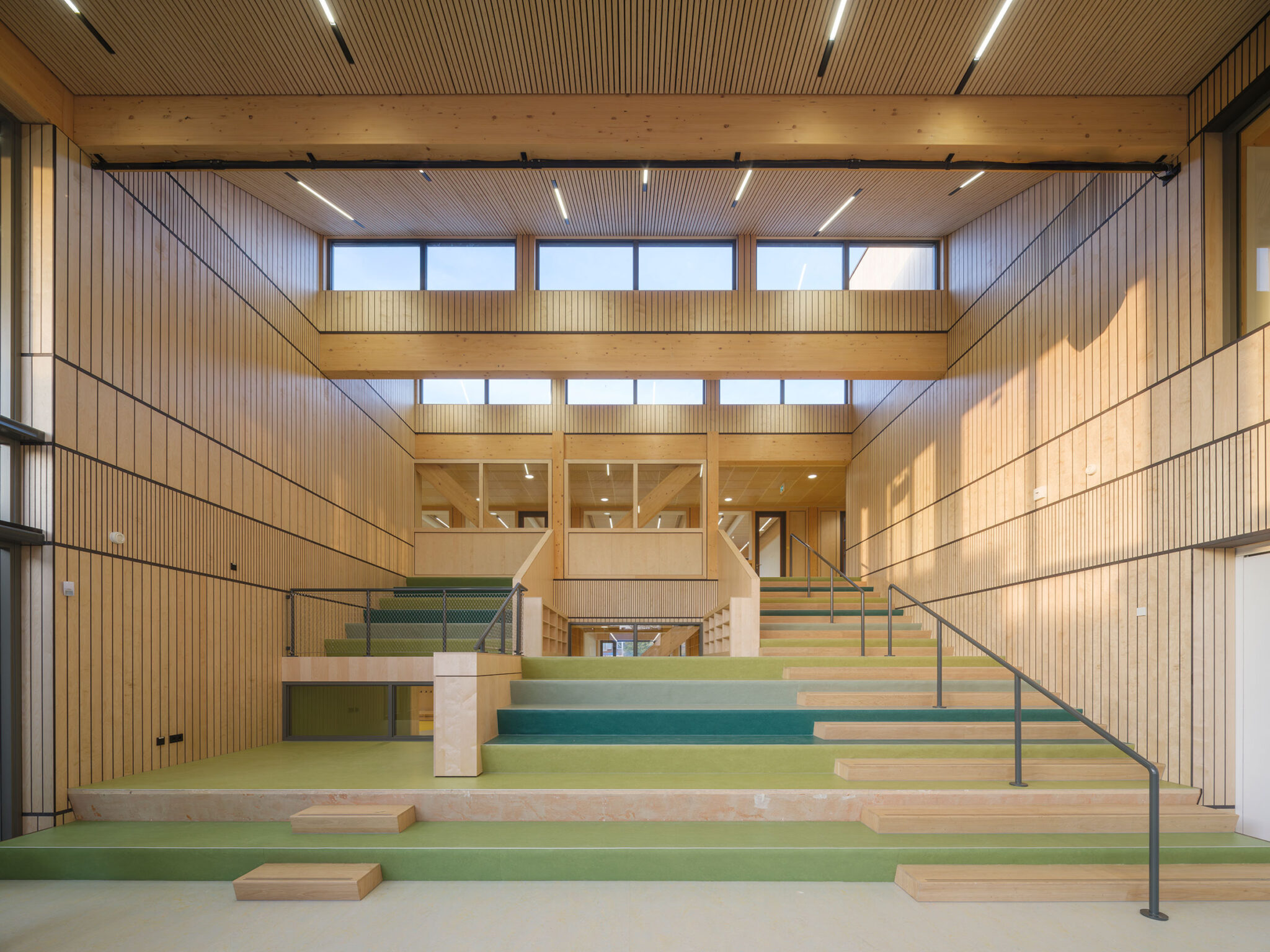 The compact building is organized around a central auditorium that functions as the school’s hub and a community gathering space. Surrounding the auditorium are learning clusters arranged in two distinct zones – one for toddlers and one for older children. Each zone has its own entrance and outdoor playground, complemented by classrooms with largely transparent facades and interior walls. The spacious corridors, more than three meters wide and filled with natural light, serve as additional learning and working spaces. Modular partitions allow classrooms and corridors to be reconfigured differently according to the needs and preferences of children and teachers, fostering creativity and collaboration.