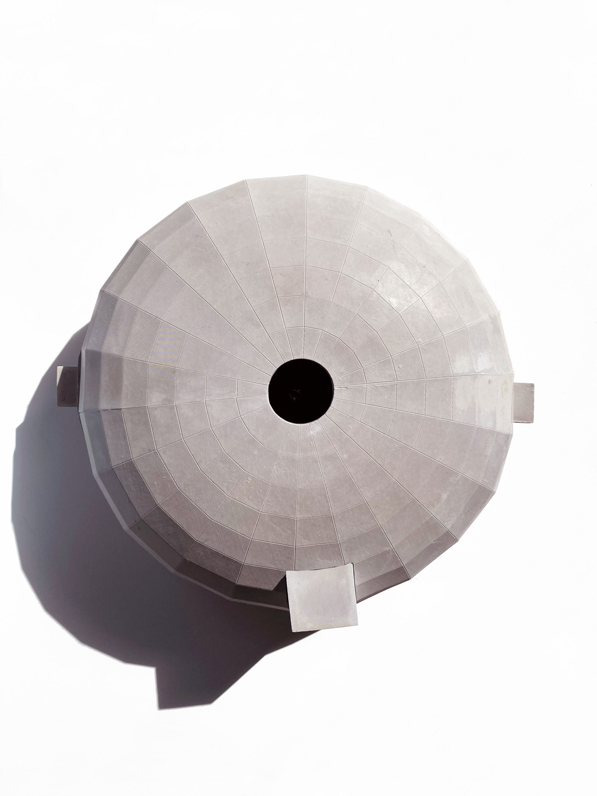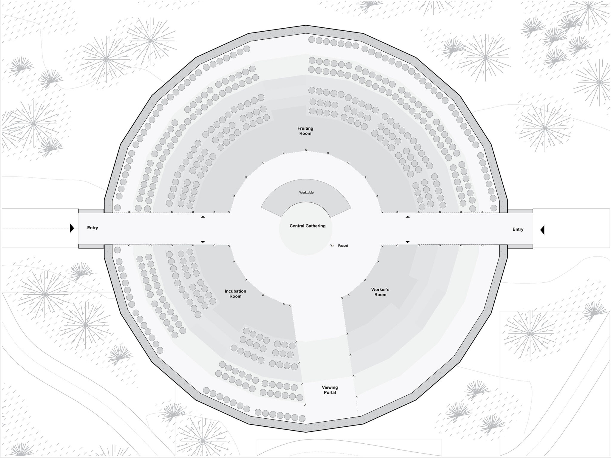 Conveying its simple yet important function, the pavilion is a basic, ellipsoidal form created to optimize interior organization for growing mushrooms. Within, the domed interior can be divided into three chambers – fruiting room, incubation room, and storage – encircling a gathering space at the heart of the pavilion. The lower half of the bowl is stepped, like an amphitheater in the round, to make shelves for handmade terra cotta mushroom pots crafted by local artisans. The stepping and elliptical form create a panopticon viewing experience, rendering the mushroom growing process visible in its entirety.