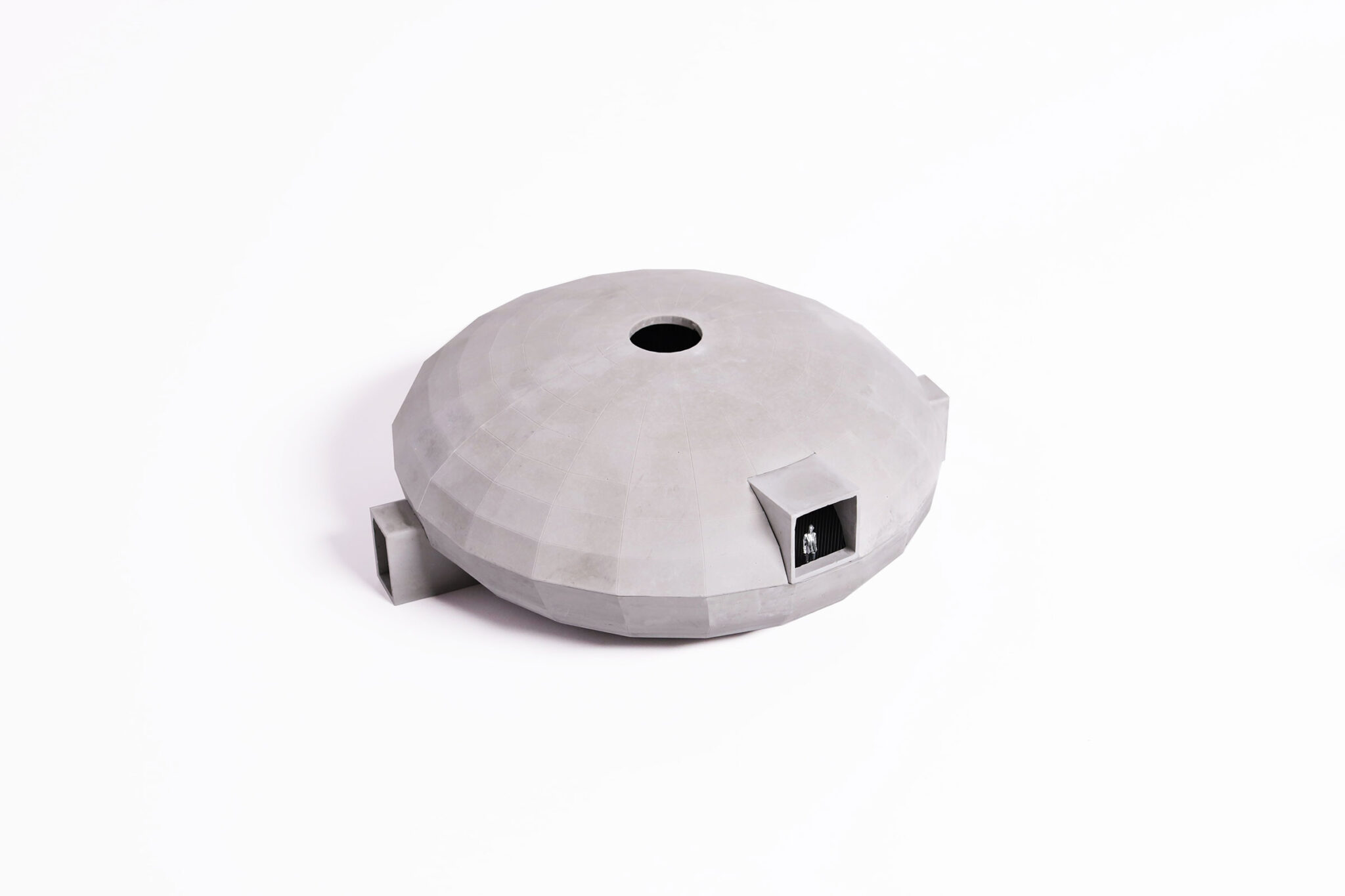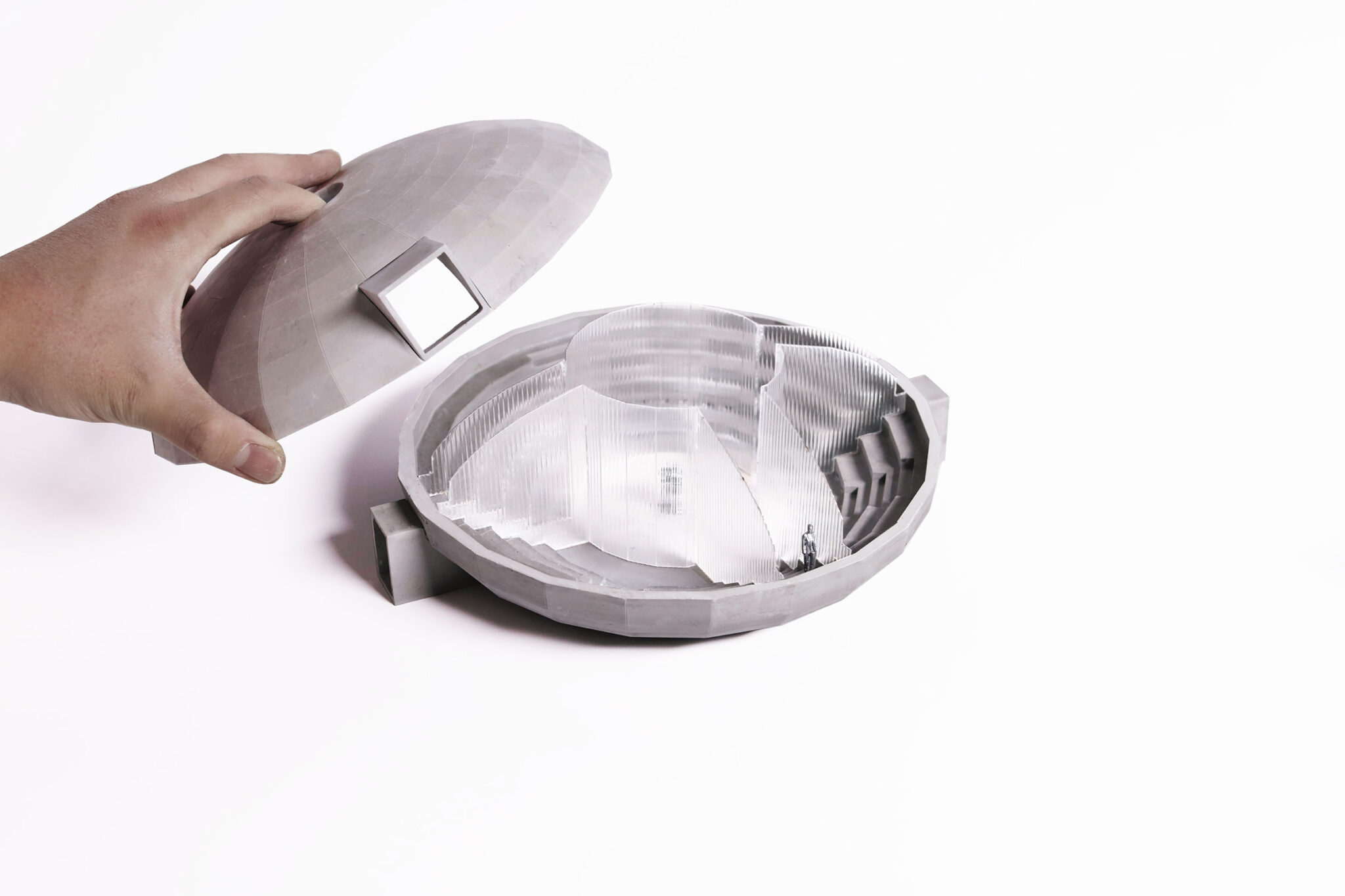 そのシンプルでありながら重要な機能を示すように、このパヴィリオンは、キノコ栽培のための内部構成を最適化するように作られた、基本的な楕円体の形状をしています。内部では、ドーム状の空間が3つの部屋に分けられます。フルーティングルーム、インキュベーションルーム、そしてストレージです。それらは、パヴィリオンの中心にある集いの空間を取り囲むように配置されています。ボウル状の下半分は、円形劇場のように段状になっており、地元の職人によって作られた手作りのテラコッタ製キノコポットの棚となっています。この段状の構成と楕円形の形態はパノプティコンのような視覚体験を生み出し、キノコの栽培プロセス全体を見渡せるようにしています。