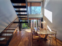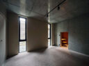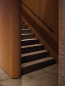 干田正浩 / MHAAによる、東京・目黒区の集合住宅「盤桓」。樹木が茂り“心地よい風”が流れる旧家の敷地での計画。木々を残し“風を取込む”建築を求め、内部から考えて“多様な住戸タイプ”を立体的に組合せる構成を考案。緑との補色関係を考慮して朱色のファサードとする3階、住戸G、2階から3階への階段 photo©藤井浩司 TOREAL