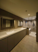 干田正浩 / MHAAによる、東京・目黒区の集合住宅「盤桓」。樹木が茂り“心地よい風”が流れる旧家の敷地での計画。木々を残し“風を取込む”建築を求め、内部から考えて“多様な住戸タイプ”を立体的に組合せる構成を考案。緑との補色関係を考慮して朱色のファサードとする2階、住戸E、正面:サニタリー、右:バスルーム photo©藤井浩司 TOREAL