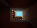 干田正浩 / MHAAによる、東京・目黒区の集合住宅「盤桓」。樹木が茂り“心地よい風”が流れる旧家の敷地での計画。木々を残し“風を取込む”建築を求め、内部から考えて“多様な住戸タイプ”を立体的に組合せる構成を考案。緑との補色関係を考慮して朱色のファサードとする2階、住戸E、ホールから開口部越しにDENを見る。 photo©藤井浩司 TOREAL
