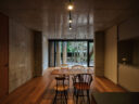 干田正浩 / MHAAによる、東京・目黒区の集合住宅「盤桓」。樹木が茂り“心地よい風”が流れる旧家の敷地での計画。木々を残し“風を取込む”建築を求め、内部から考えて“多様な住戸タイプ”を立体的に組合せる構成を考案。緑との補色関係を考慮して朱色のファサードとする1階、住戸C、ダイニングからリビングを見る。(建築家による解説:木漏れ日と庭のリビングダイニング) photo©藤井浩司 TOREAL
